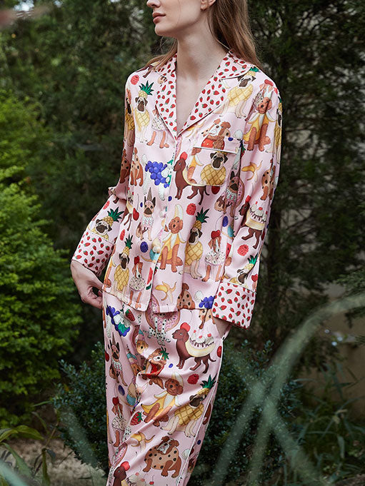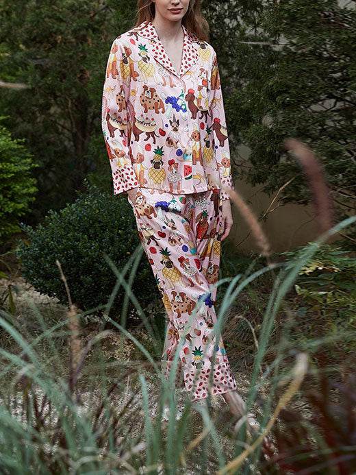 Sweeten your dreams with the Pink Dessert Dog Pajama Set. a fun and cozy treat for both dog lovers and dessert enthusiasts! Featuring an adorable print of playful pups surrounded by delicious desserts. this set adds a whimsical touch to your loungewear collection. Made from soft. breathable fabric. it's designed for ultimate comfort. perfect for those lazy mornings or cozy evenings at home.