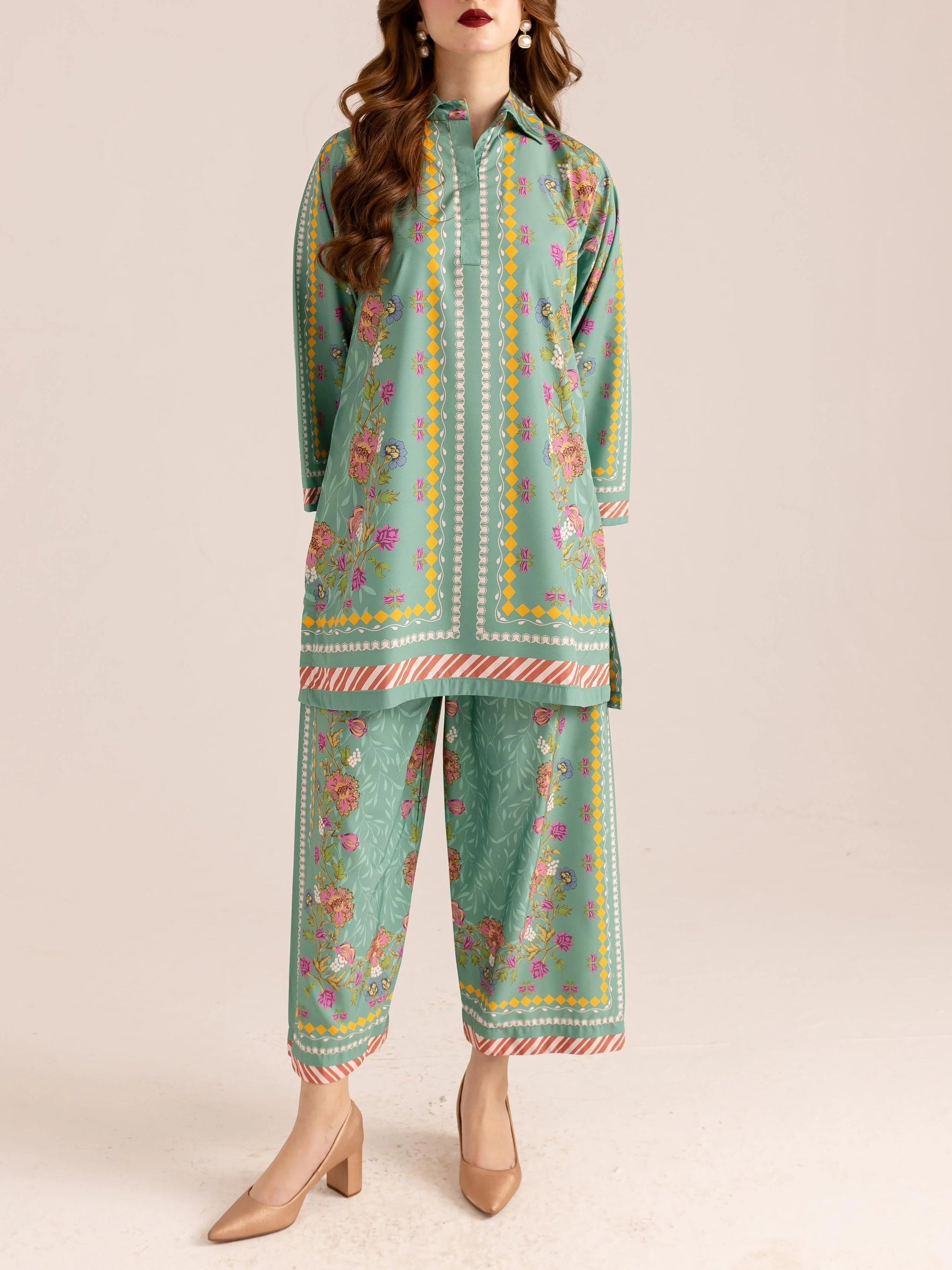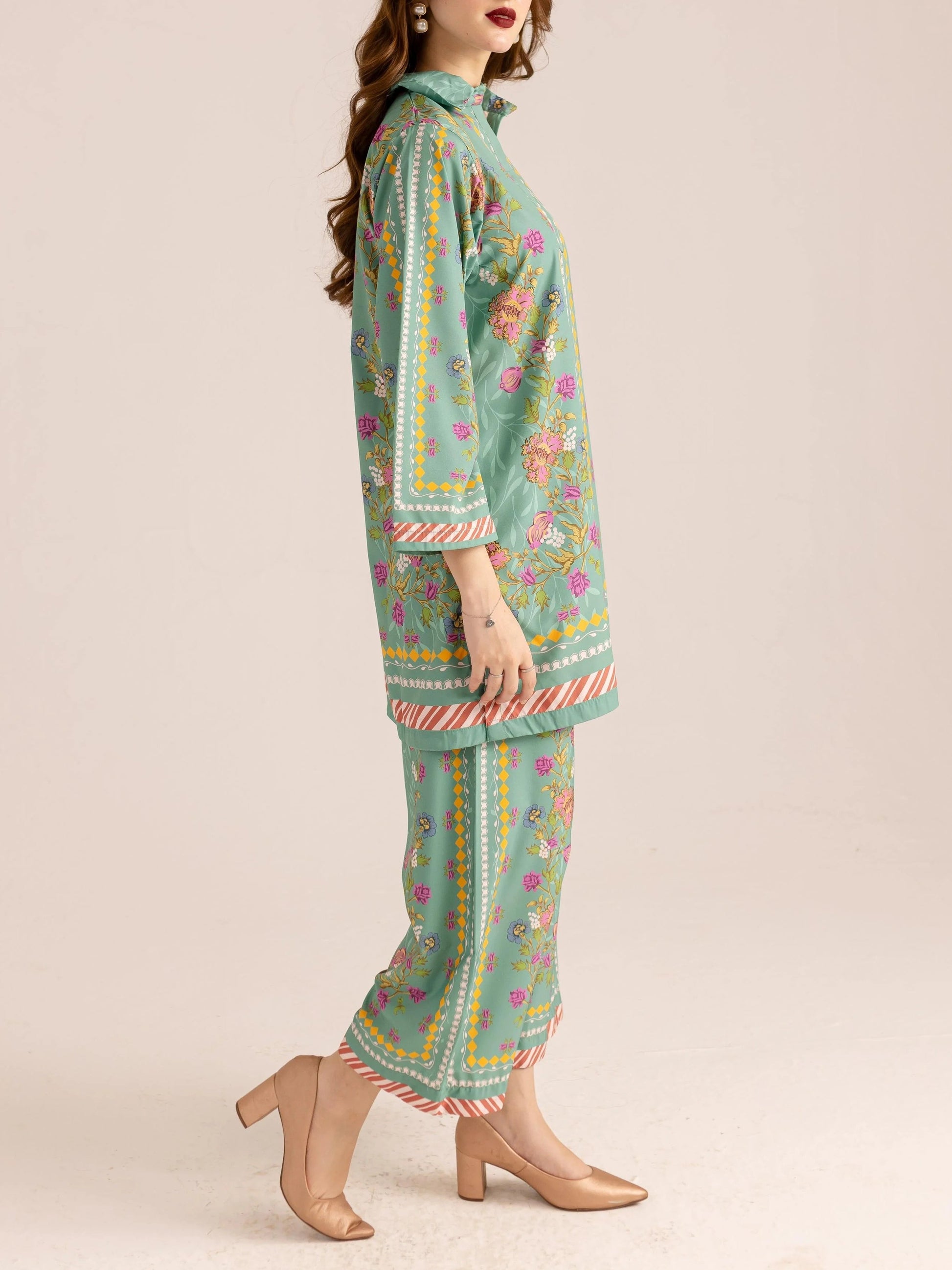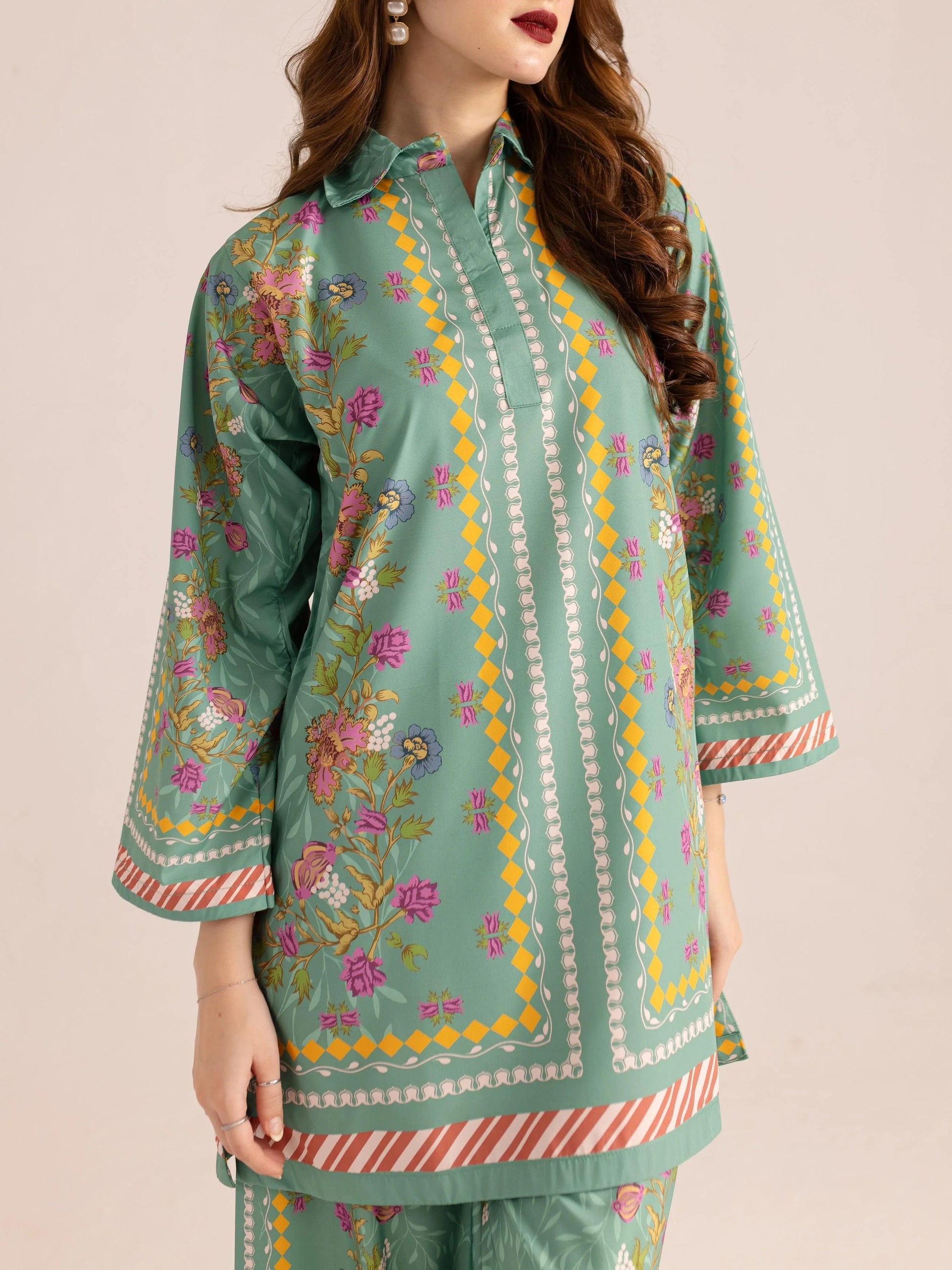 This co - ord set in soft pastel green is a visual delight. The shirt. with a collared neckline. showcases a mix of dainty florals. geometric dots. and striped trims. The matching pants mirror the charming patterns. Crafted from flowing fabric. it offers comfort and a breezy silhouette. Ideal for adding a fresh. artistic touch to your wardrobe. perfect for brunches or garden parties. blending elegance with a fun. eclectic vibe.