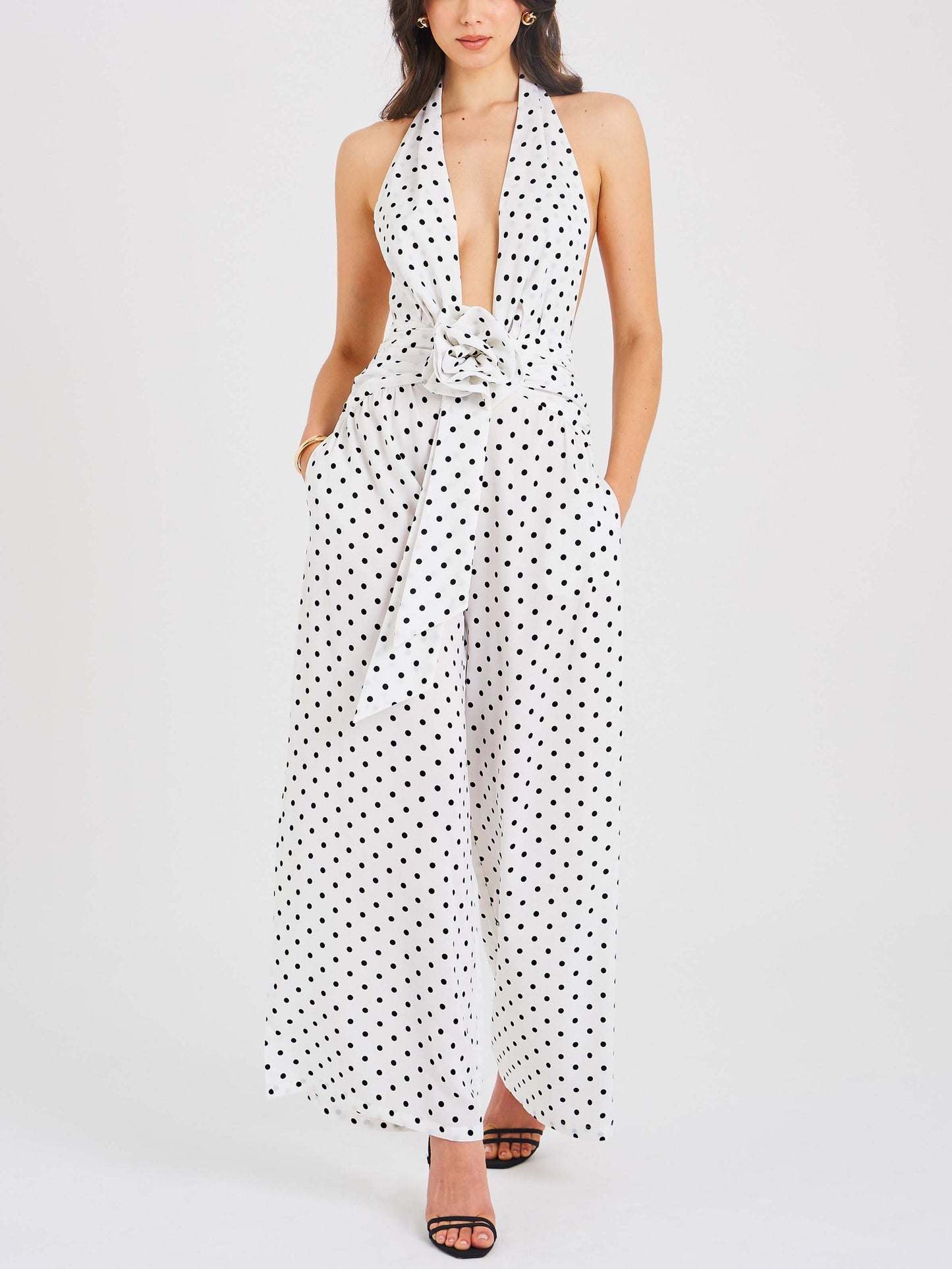 Retro Polka Dot Classic Deep V-Neck Open Back Polka Dot Jumpsuit