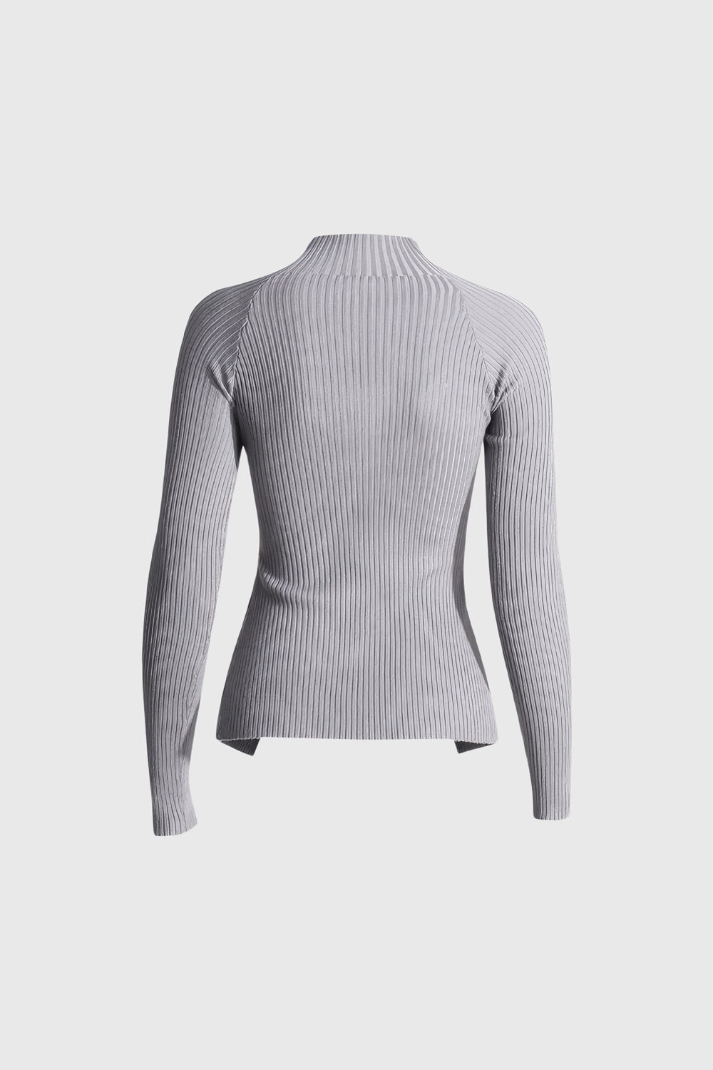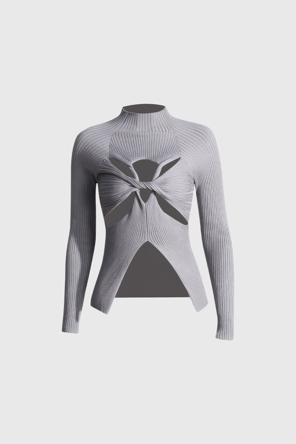 The high-neck and long sleeves provide a classic silhouette. while the unique cutouts on the chest and stomach add a daring twist. These cutouts are tastefully tied together with black strings. creating an eye-catching detail that sets this sweater apart from the rest. Crafted from ribbed fabric. this sweater offers both comfort and style.