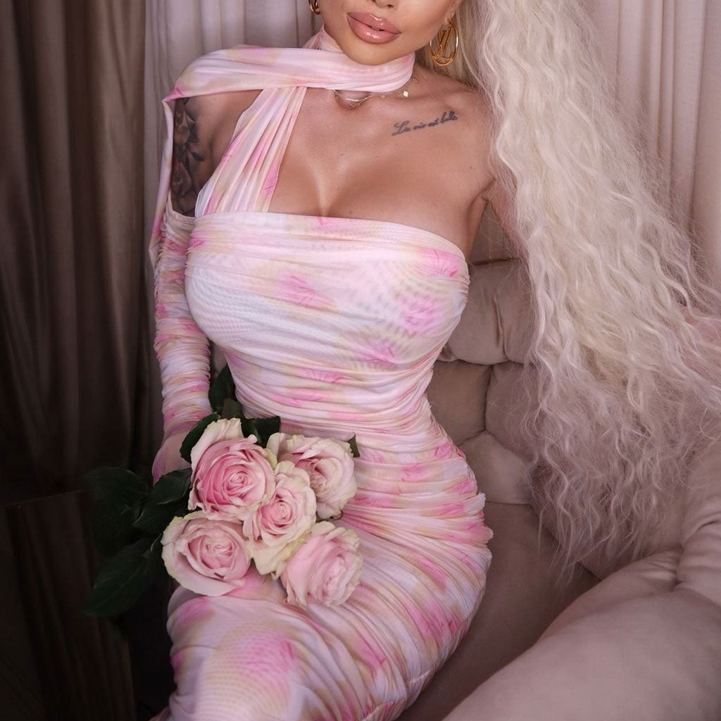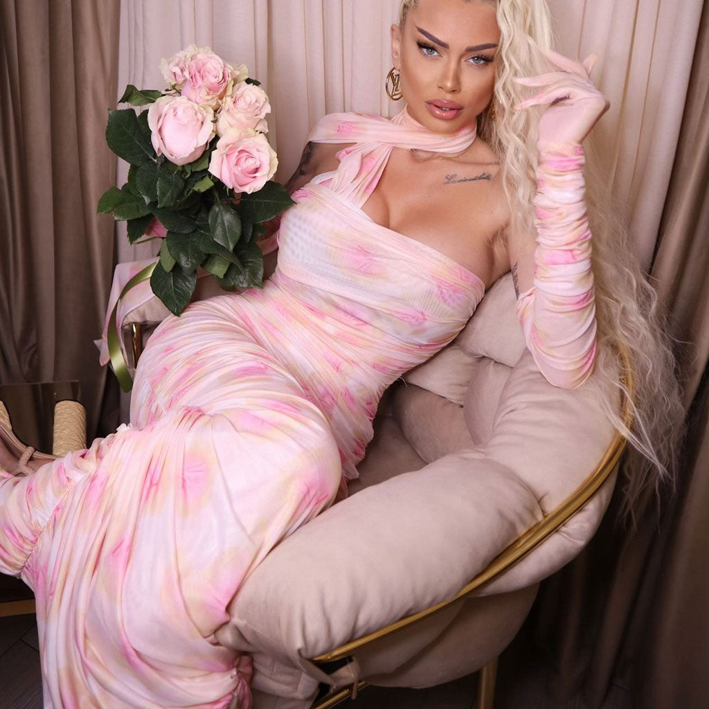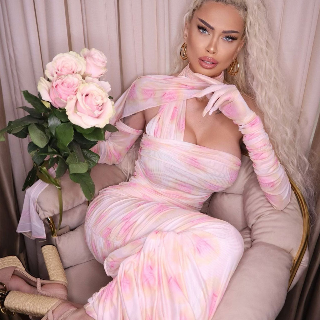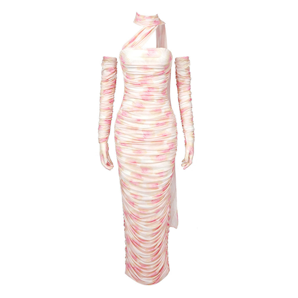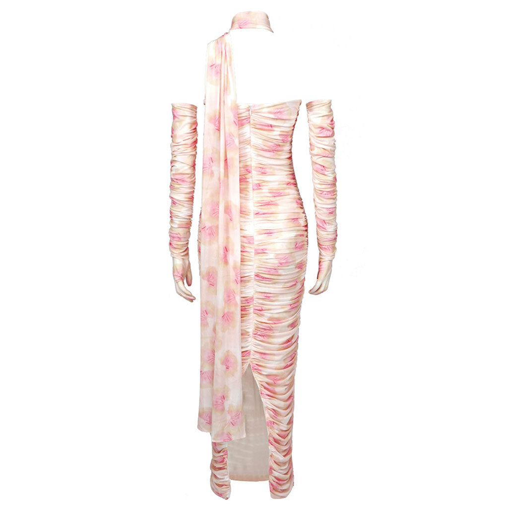 Our designer dress is a perfect balance of elegance and edge. A modern take on a super-feminine floral print in the sweetest pink shade. this printed dress is sure to make a statement. Its long draped-halter mesh ribbon and all-over ruched detailing exude sophistication and femininity. making it ideal for any special occasion. Secured with the concealed rear zip fastening. the close-fitting silhouette has a back split for an ease of movement. Elegant and timeless. these long gloves can easily take your evening look to the next level. Simply pair this fancy maxi dress with stilettos. Peak pretty!