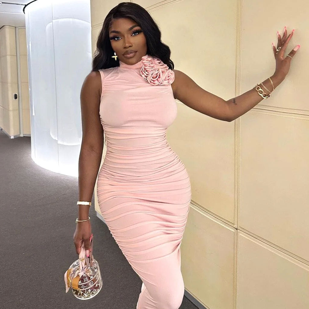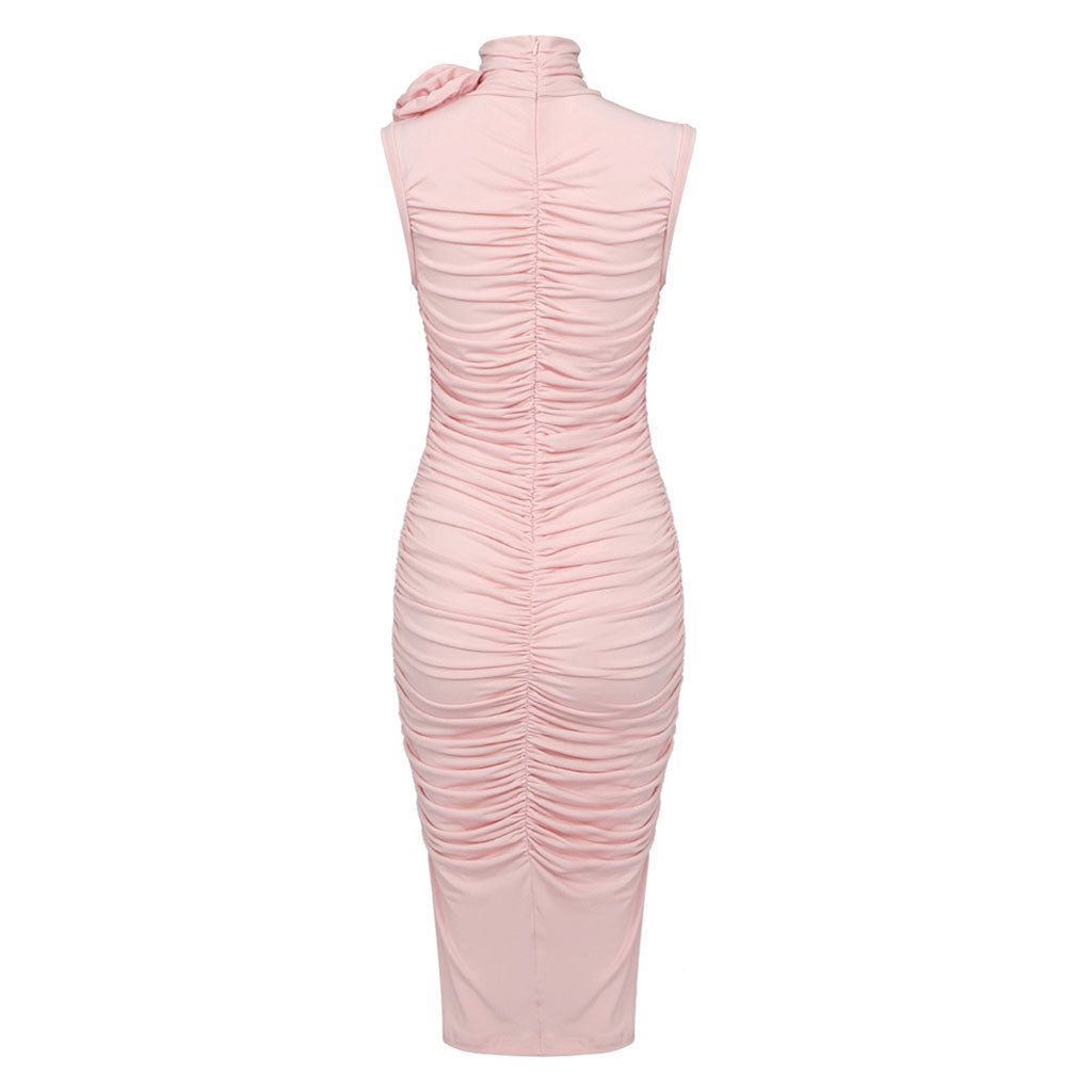 Romantic Floral Corsage Ruched High Neck Sleeveless Bodycon Midi Cocktail Dress