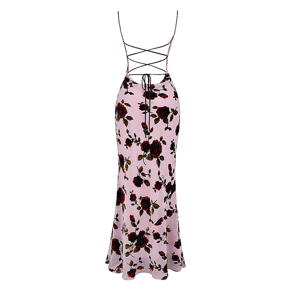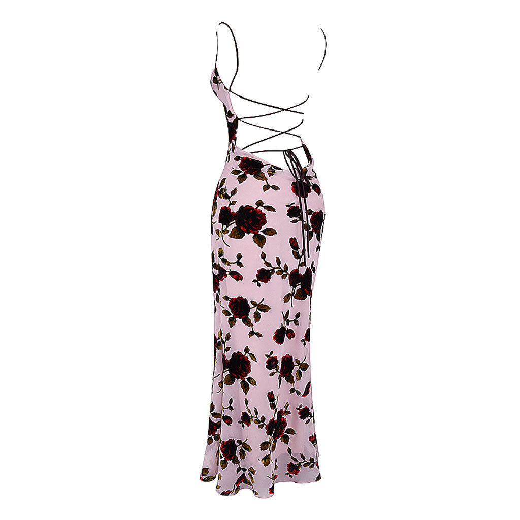 Romantic Floral Print Cowl Neck Cami Lace Up Open Back Maxi Dress