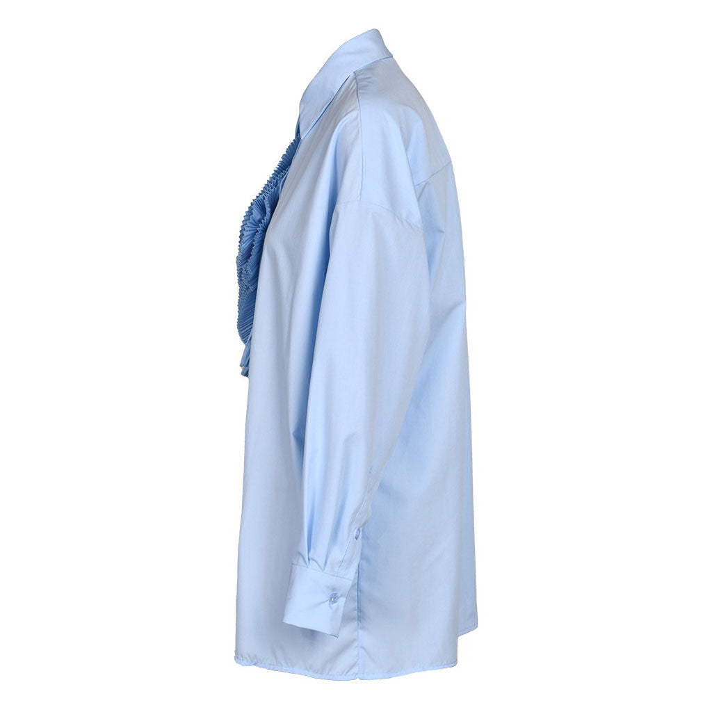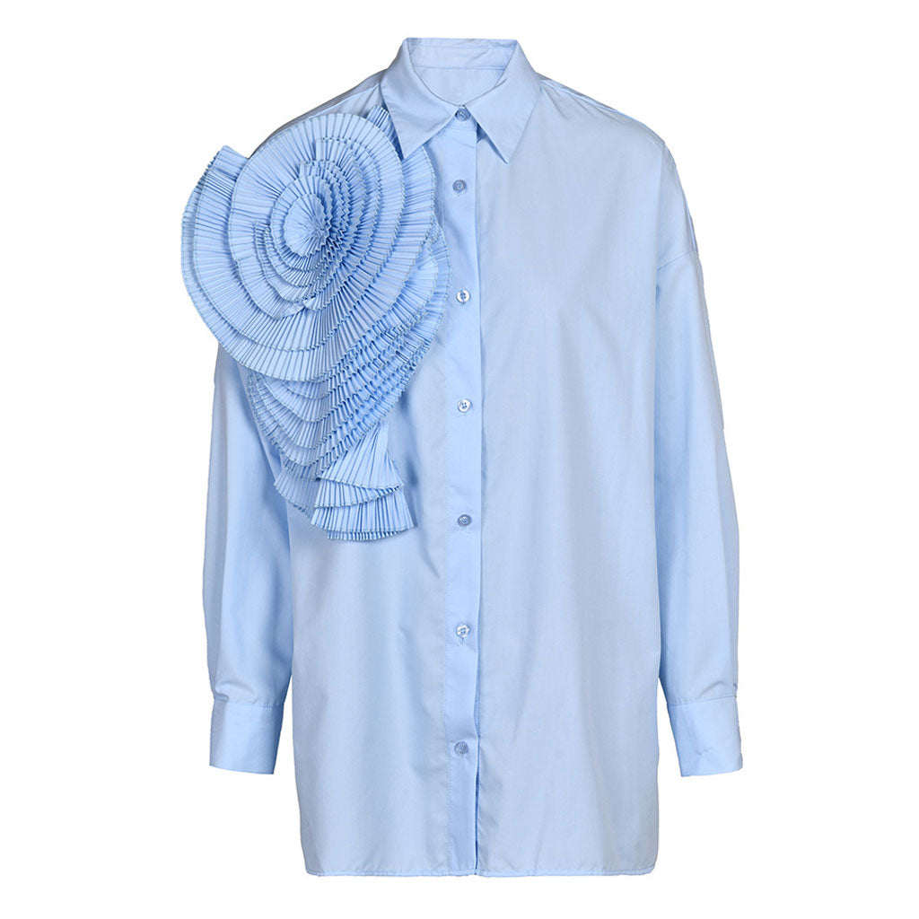 Dressy big! Delight in the enchantment of our one-of-a-kind avant-garde shirt. a seamless fusion of artistic finesse and contemporary design. The meticulously crafted sculptural pleat detail and delicate petal accent come together to create an entrancing and three-dimensional effect. infusing this classic silhouette with an air of artistic elegance. Impeccably tailored with a pointed collar and buttoned long sleeves. this shirt exudes an undeniable sense of sophistication. Its effortless oversized fit adds a touch of relaxed chic. ensuring comfort without compromising style. From formal affairs to casual gatherings. this designer masterpiece proves its versatility as a statement piece that effortlessly elevates any outfit.Â