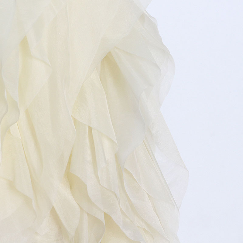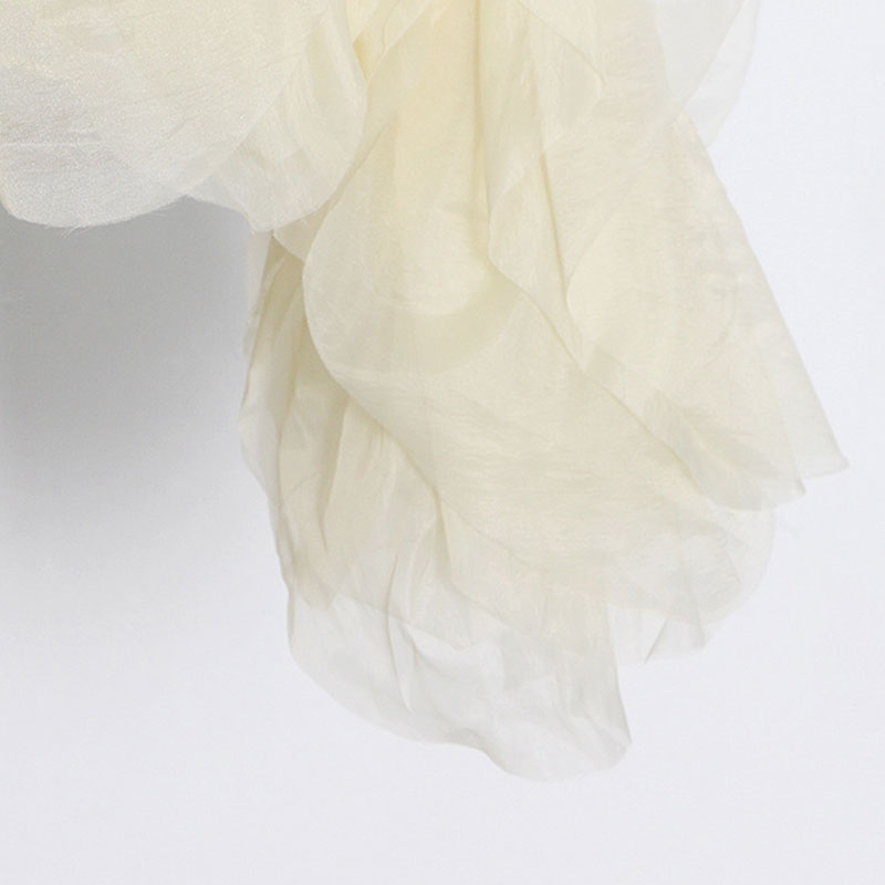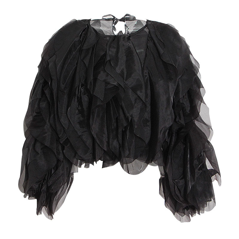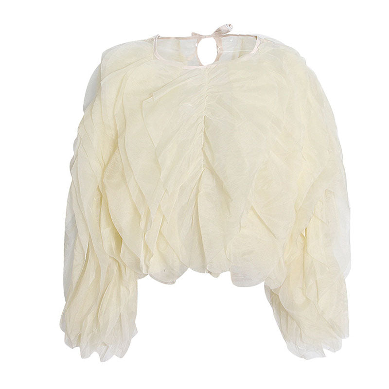 Semi Sheer Chiffon Layered Ruffle Puff Sleeve Round Neck Cropped Blouse