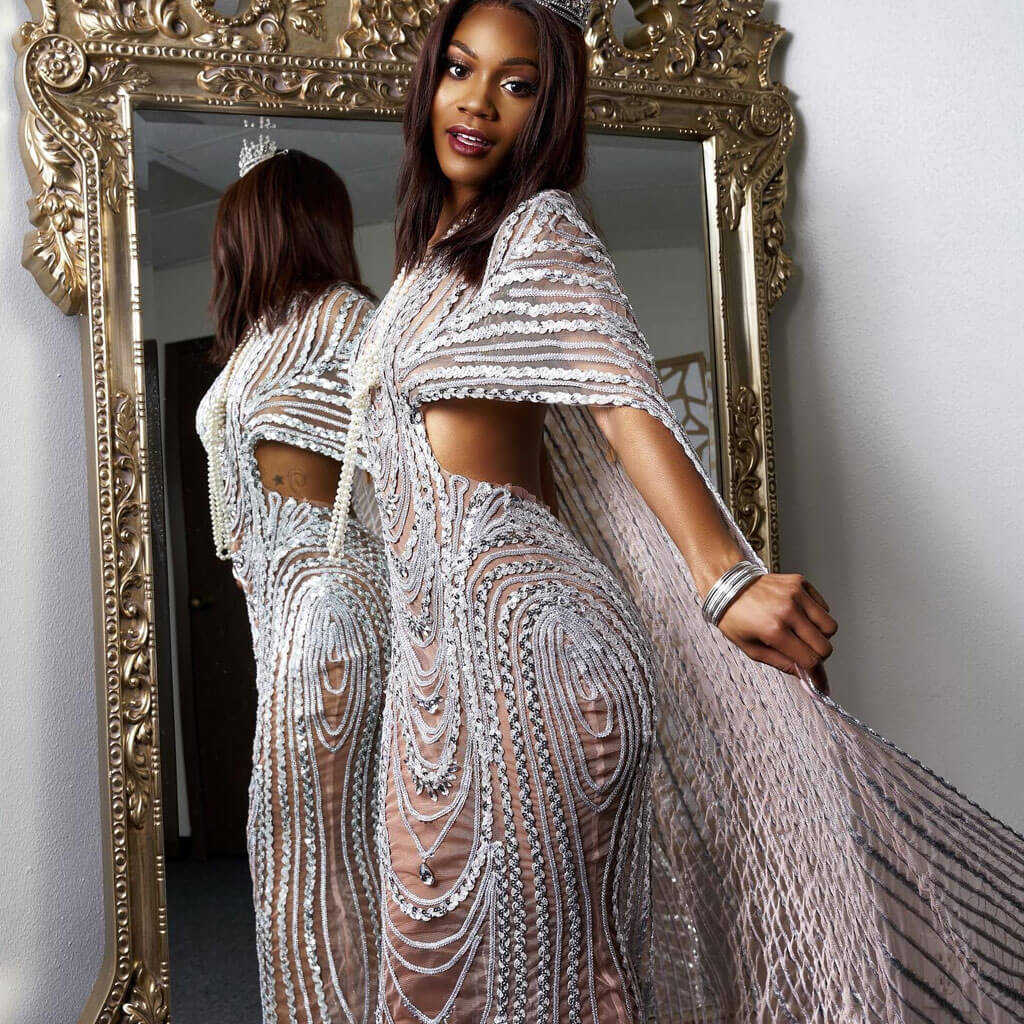 One easy way to express your personal style on the ball? Opt for a brilliant designer embellished gown! If you're drawn to the allure of glitzy sequins and the radiance of diamante embellishments adorning your exquisite ball gown. then this piece is tailor-made for you. Craving that extra touch of sophistication? Our luxurious floor-sweeping mesh dress boasts a daring cut-out at the waist side and features a beautifully flowing cape. With its jaw-dropping cape design. this sparkly evening maxi gown embodies pure elegance �you'll find minimal need for additional accessories.