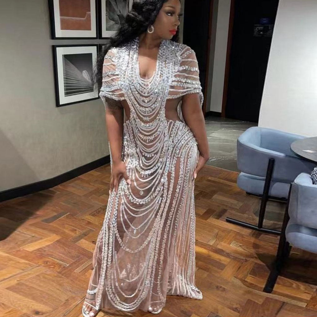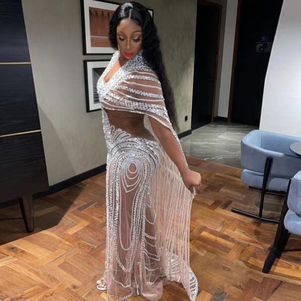 Sexy Crystal Accent Drape Cape Cutout Sheer Mesh Sequin Festive Maxi Formal Dress