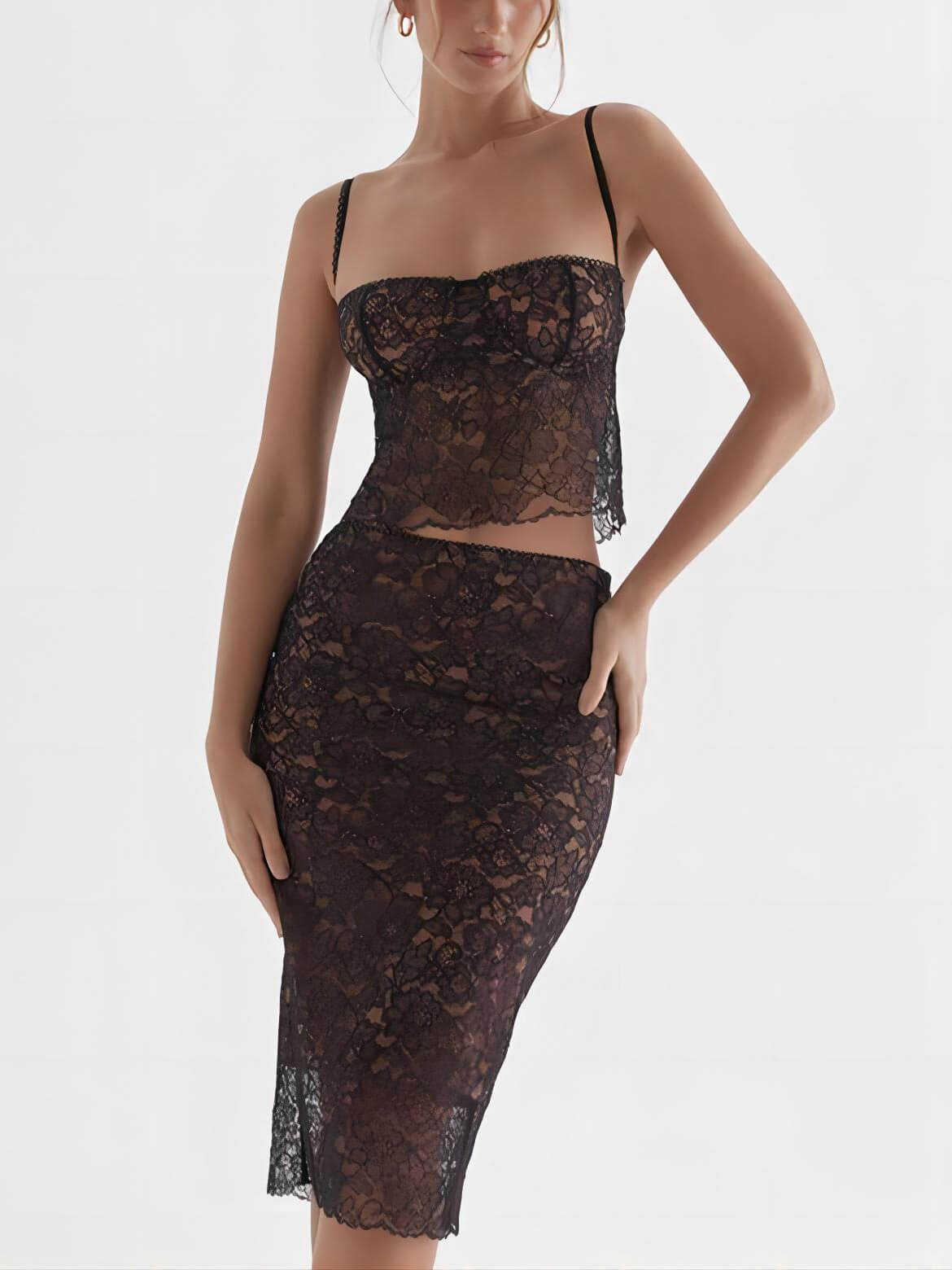 Elevate your look with Nsbua®'s sexy lace crop top and hip-hugging skirt two-piece set. Paired with a delicate lace crop top and matching skirt. the set features a hip-hugging silhouette for a sophisticated. cohesive look. Available in black. this set is stylish and elegant. perfect for parties or special occasions.