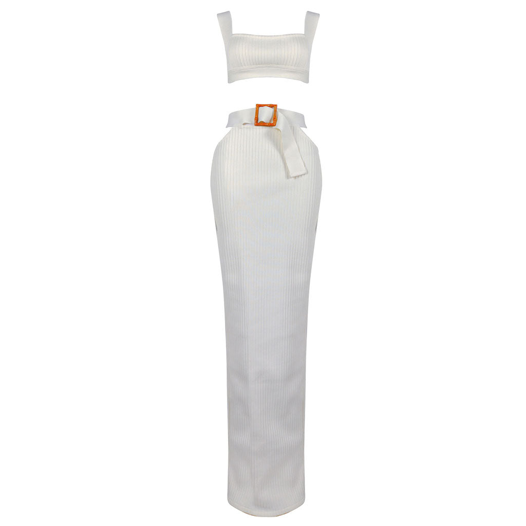 Revamp your summer wardrobe with cozy yet stylish lingerie-style knit sets that can be worn layered or as separates. This gorgeous off-white set is the perfect choice! The set includes a slip-on ribbed knit sleeveless top with suspender shoulder straps and a trendy cropped hem. Pair it with the bodycon ribbed knit maxi skirt. which boasts a cinched belt at the high-rise band and daring cut-outs at the sides. Complete with a hidden zip closure at the back. this ensemble exudes confidence and is sure to make heads turn.