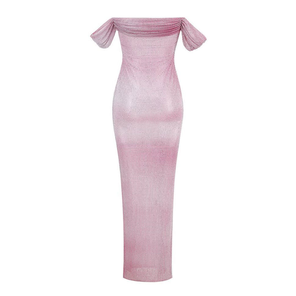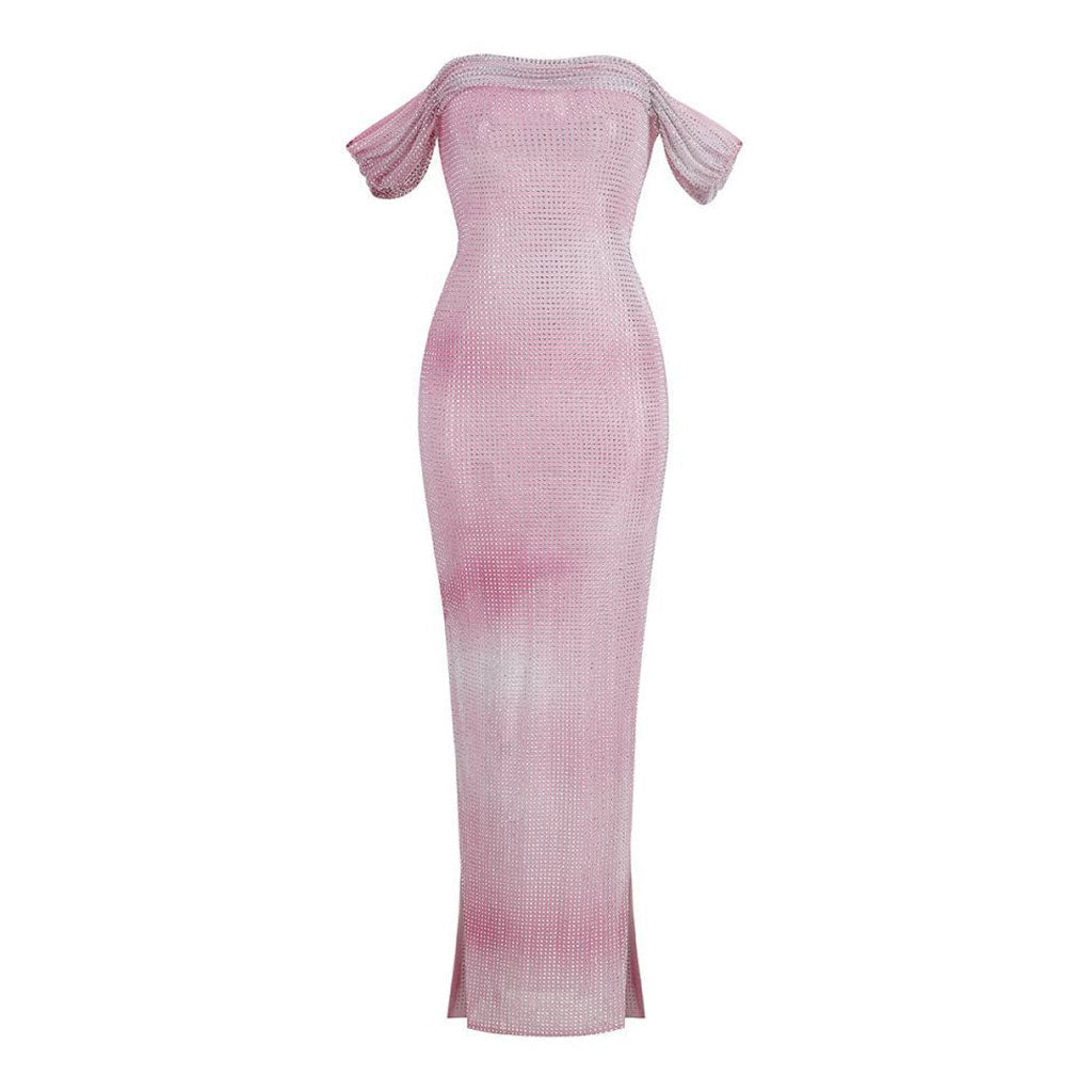 Y'all ain't ready for the dazzling diva vibes this dazzling designer gown brings! With sparkly pink rhinestones on sheer mesh. it's like catching fireflies on a summer night. The chic off-the-shoulder neckline and draped sleeves are more irresistible than a plate of biscuits. This figure-hugging silhouette and discreet side zipper will have you lookin' like a Southern belle. And them side splits? Well. they're sassier than a cat on a hot tin roof! With ombre-style gradient. it's like a sunset over the bayou.