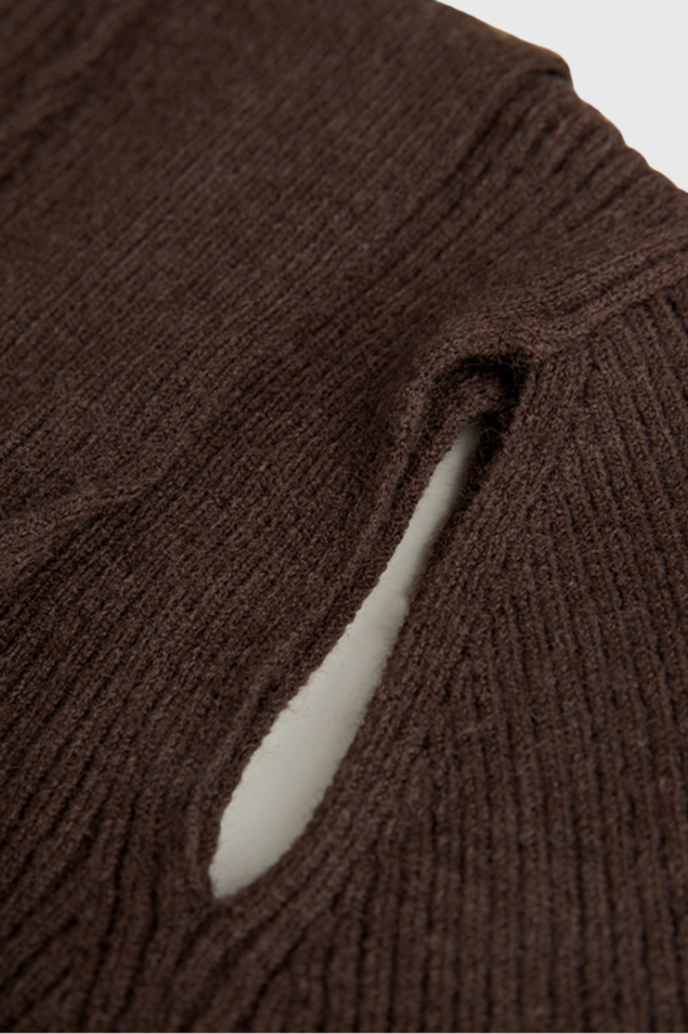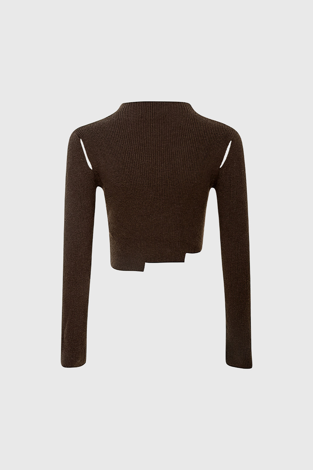 This Short Knitted Top with Cut Hem is a ribbed knit top with a high neck and long sleeves. It features shoulder cutouts and a ruffle detail on the front. The hem is cut in a unique style for an edgy look.