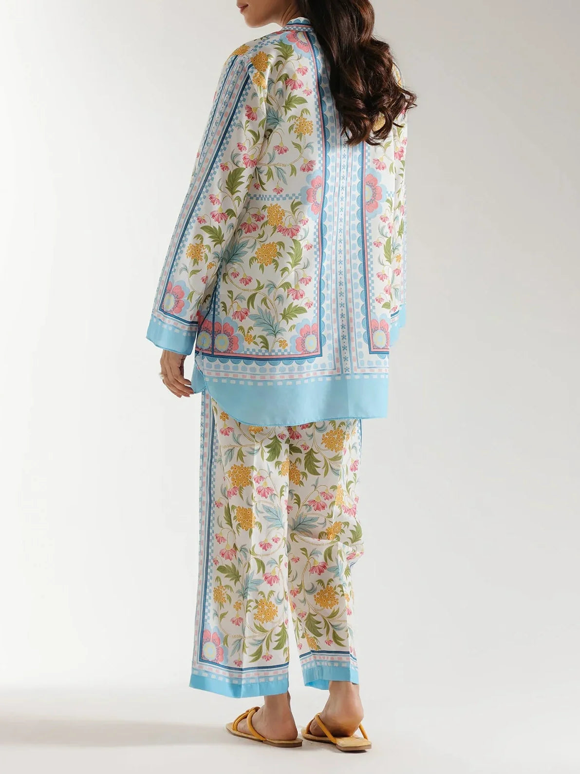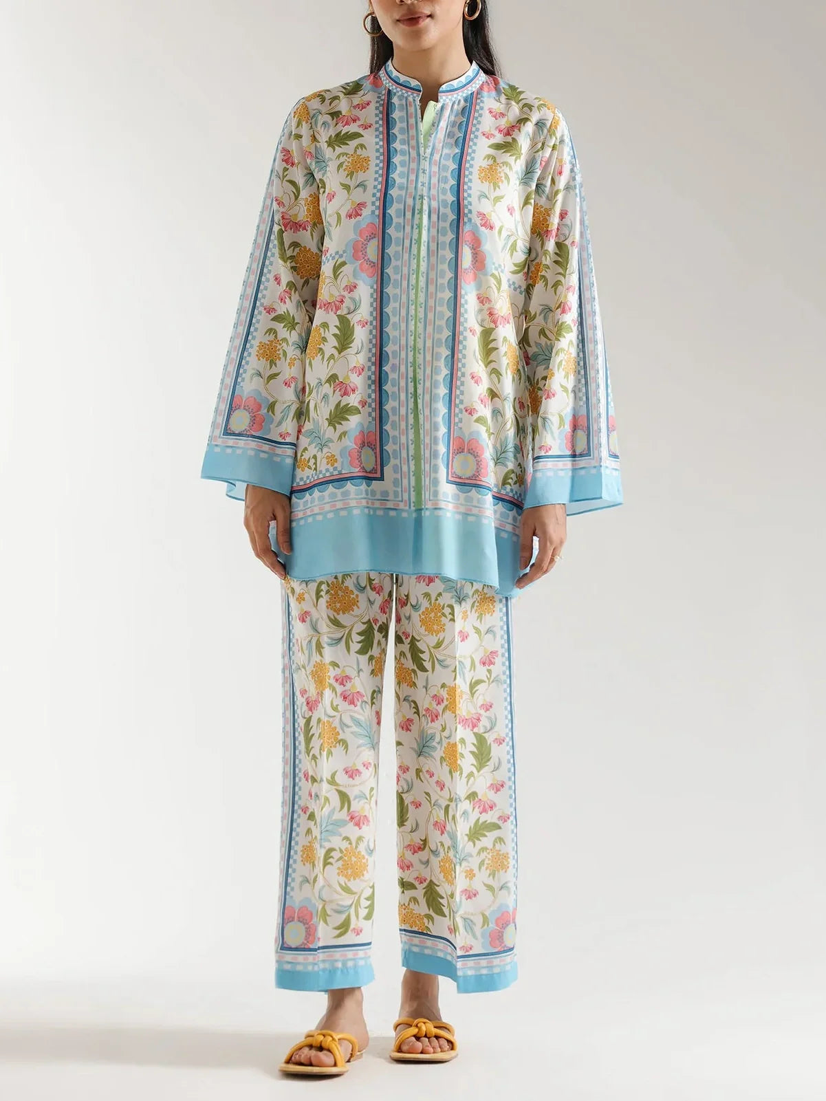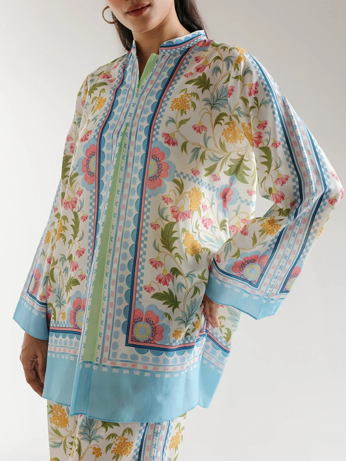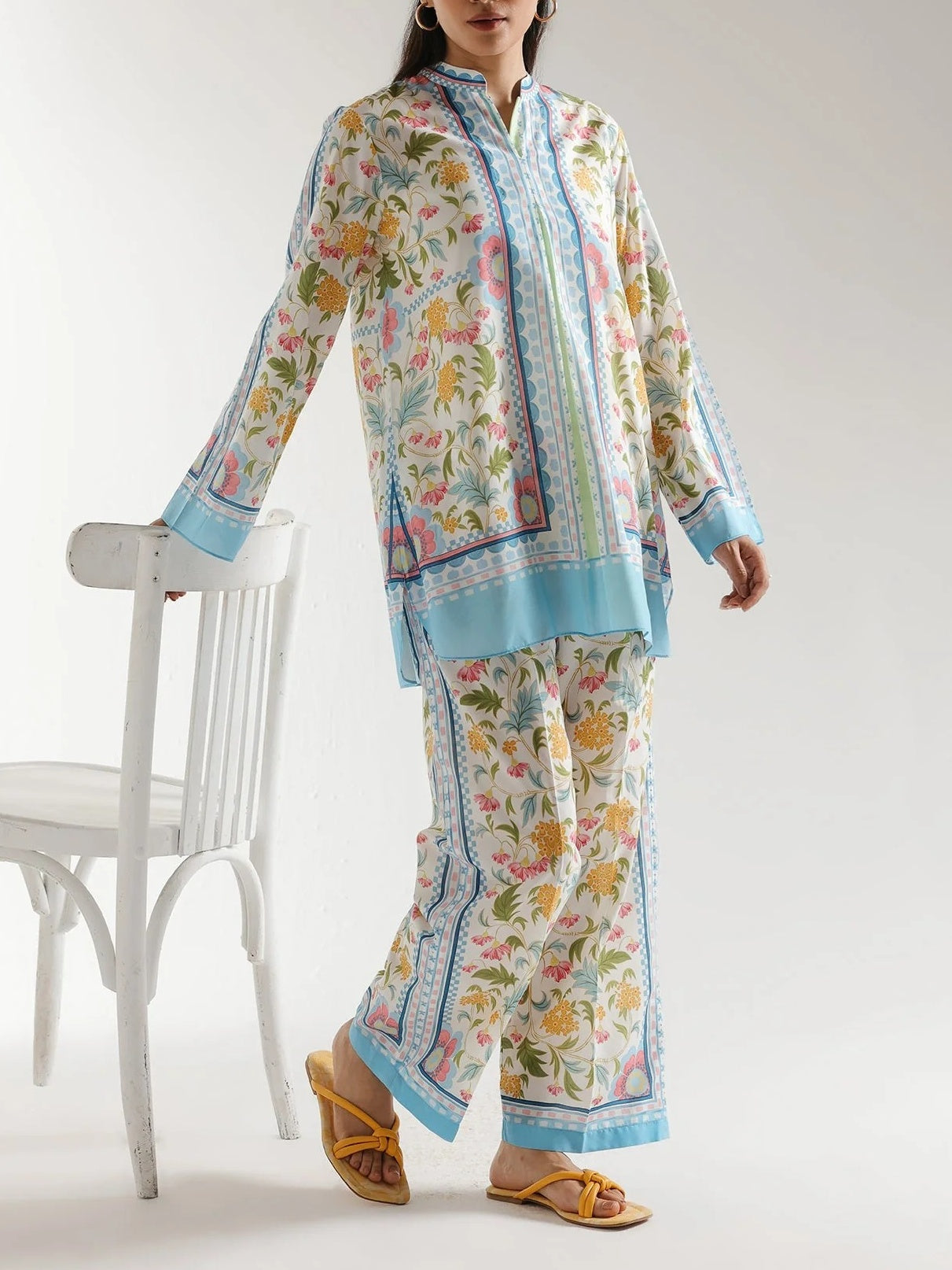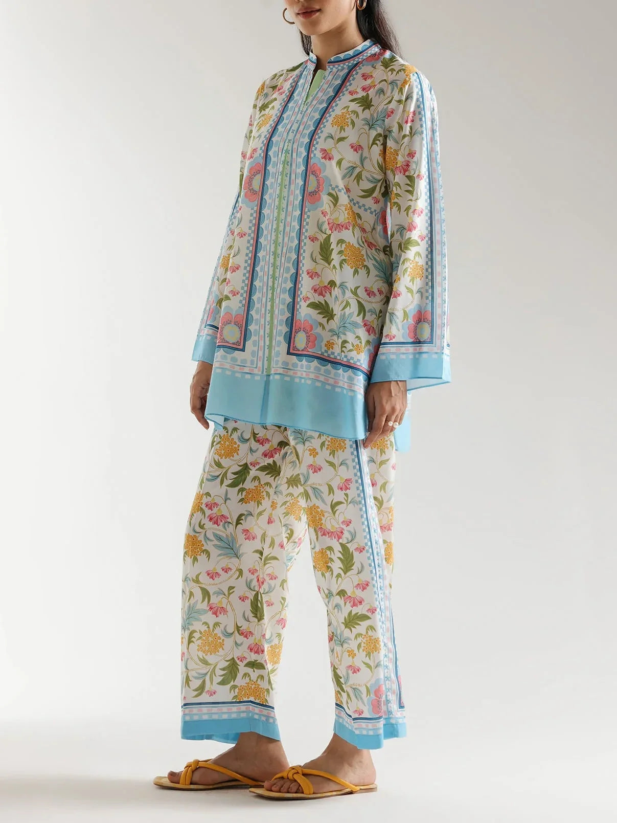 This refreshing two-piece set features a vibrant floral print on a white base. framed with delicate sky blue borders. The tunic top has a mandarin collar and relaxed fit. paired with wide-leg pants for ultimate comfort and elegance. Made from lightweight fabric. it's ideal for warm weather and perfect for casual outings. resort wear. or lounging in style. The intricate botanical design adds a timeless charm while the pastel palette keeps the look soft and feminine.