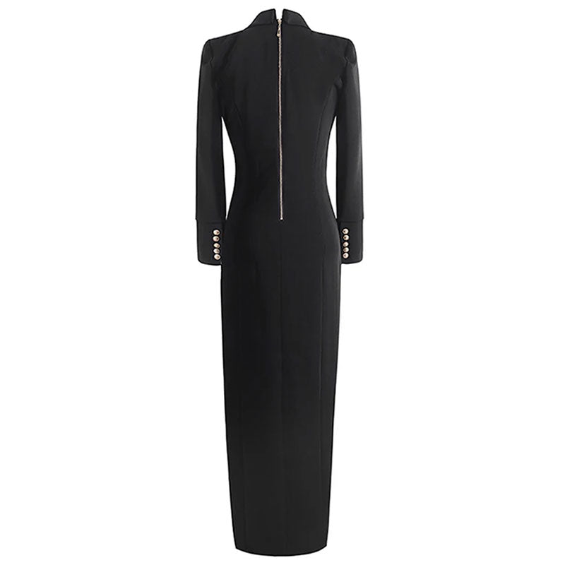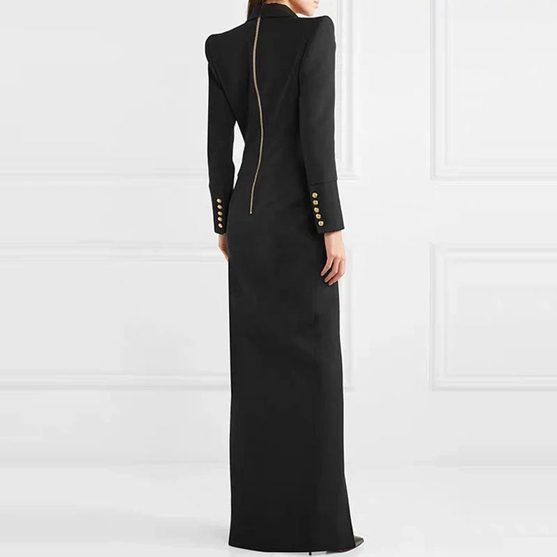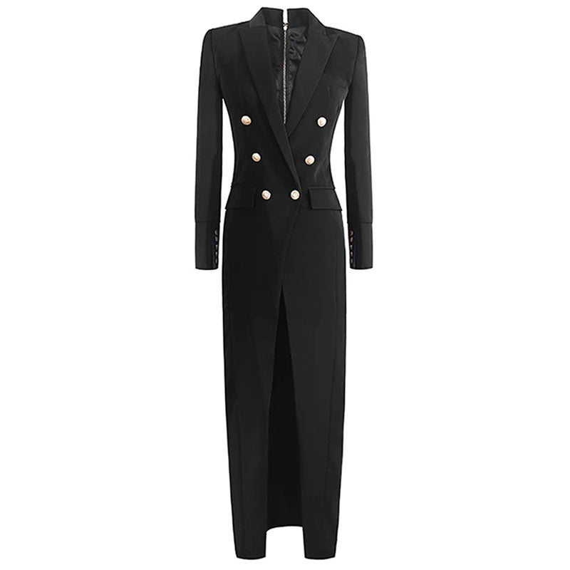 This designer blazer coat will seamlessly take you from the office to the party. The notch lapel collars. adorned with a V-neck. exude refined elegance. complemented by a double-breasted placket adorned with opulent golden embossed buttons. A metallic zip back and a front high slit add a contemporary edge to its timeless silhouette. featuring long sleeves and faux front flap trim. This tailored cut. reminiscent of iconic sophistication. defines this long tailored jacket. merging classic elements with modern chic to elevate your wardrobe.