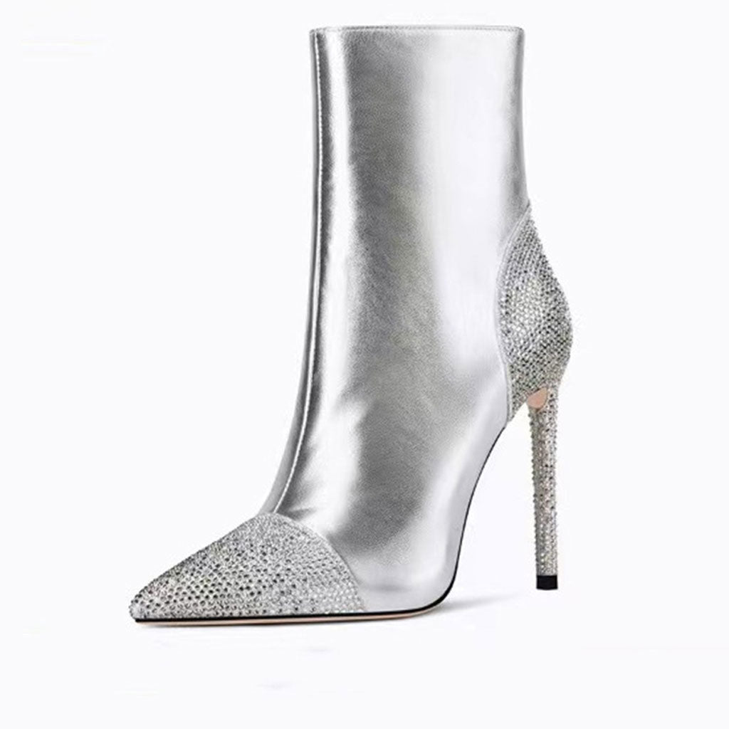 Leave it up to us to give you a shining bright upgrade with these attention-commanding boots! This sultry pair is crafted from high-end imitated leather and a 4.33-inch cigarette heel that's accessorized by shimmery strasses which will keep you looking and feeling glamorous for an elevated look. Made with sharp pointed toe. they are accented with a score of rhinestone embellishment at the sexy vamp that continues the luxury with the crystal ornamented heel cap at the back. Timeless and flirty. they are styled with a special shade of silver and presented a smooth and classy textured exterior which is such a work of art. Team these charmers with your favorite mini dress and add some silver toned accessories to echo the color from head to toe.
