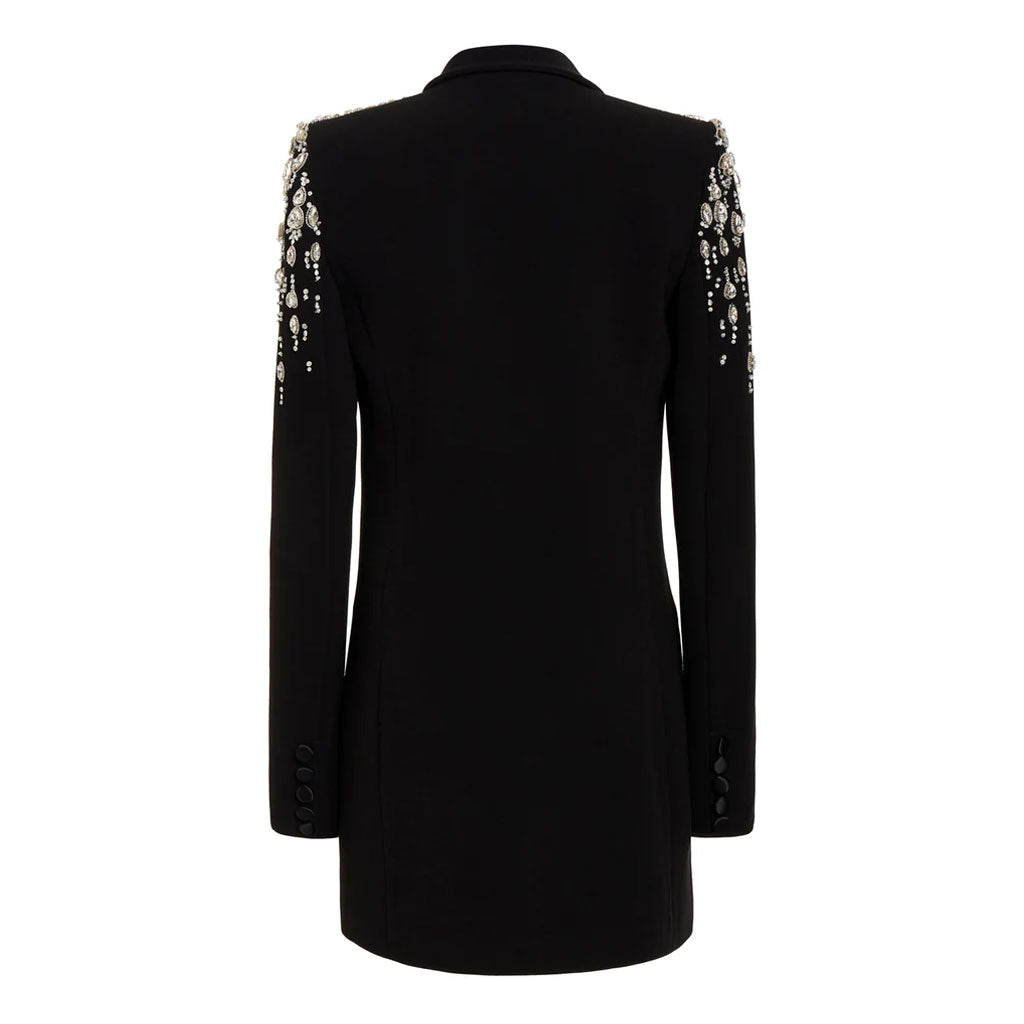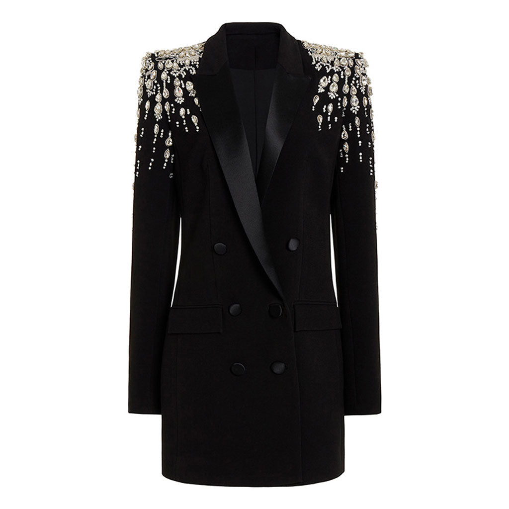 Gleaming crystals accentuate this elegant designer blazer's extended shoulders and long sleeves. as well as the chic silky lapel collar. double-breasted closure. and flap front pockets. supplying a tailored. cinched trend this season. The sharply defined shoulder provides a sense of confidence and poise. This captivating. ready-to-work piece easily transitions into an on-trend. hip-length party dress. ideal for a festive night out. Pro tip: accentuate the look by donning it alongside statement tweed shorts and heels for a polished finish.