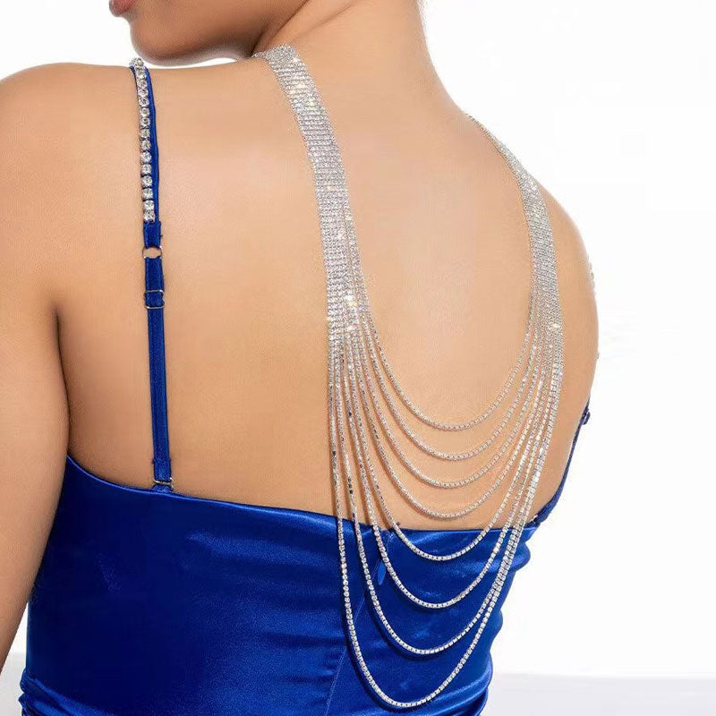 Obsessed is an understatement! The back-drop necklace comes in silver-plating construction which is topped with sparkly crystal stones in a long opera necklace silhouette. The wide silver chain is divided into several strands of slim chains. giving a layered fringe effect that drapes along your back. The pullover style is easy to wear. It looks beautiful with those backless dresses and equally gorgeous with the silky wedding gowns.