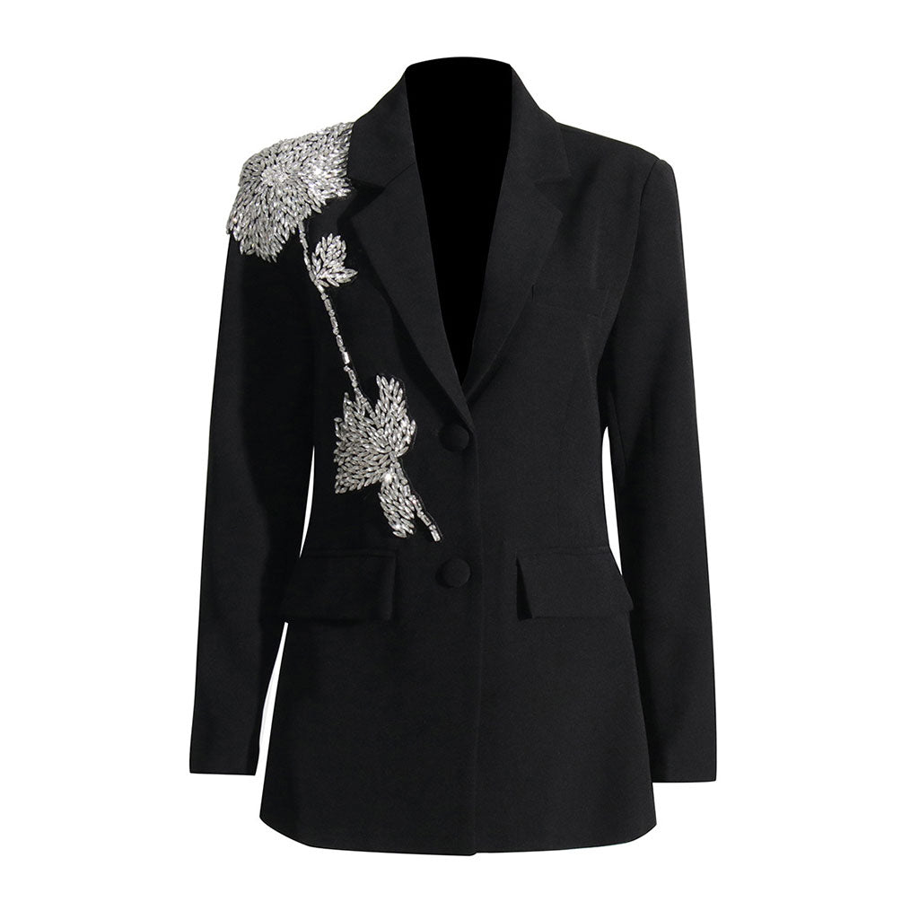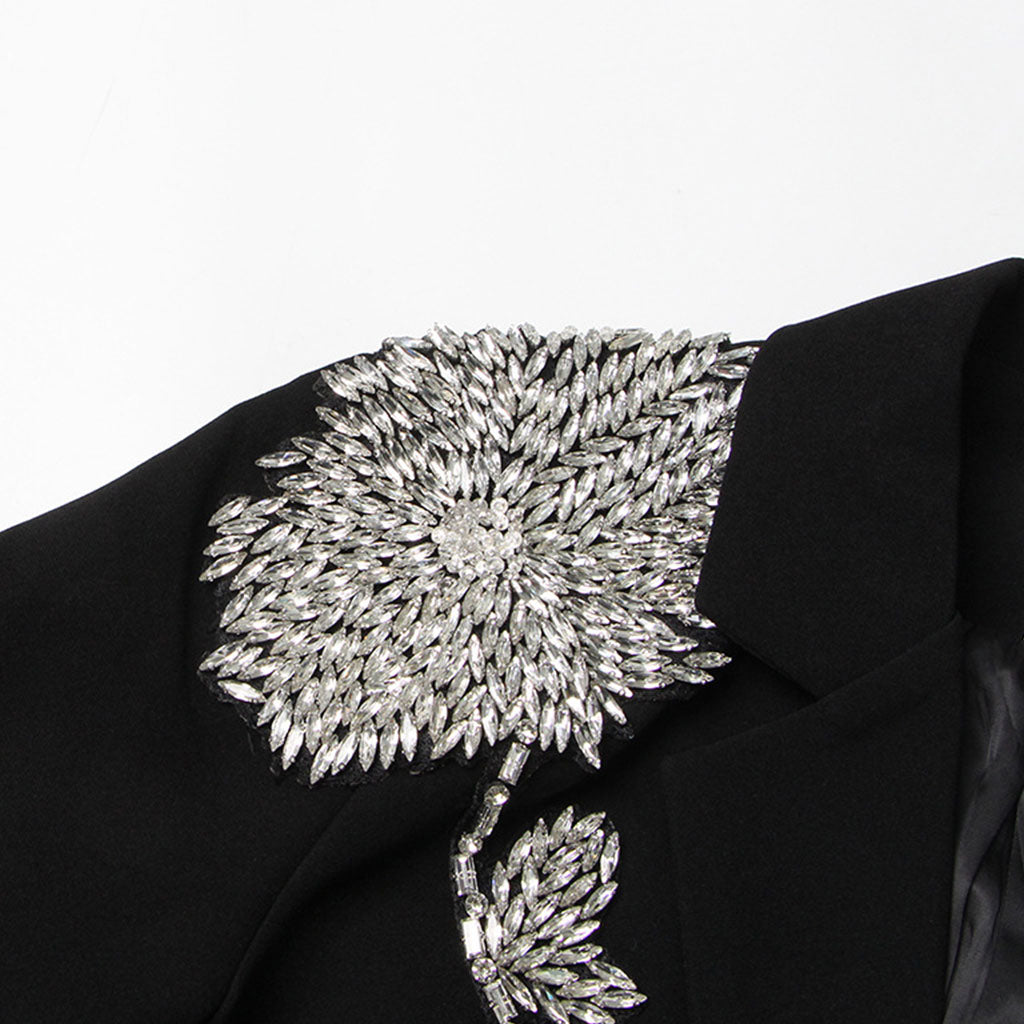 Sparkly Rhinestone Rose Detail Lapel Collar Single Breasted Blazer