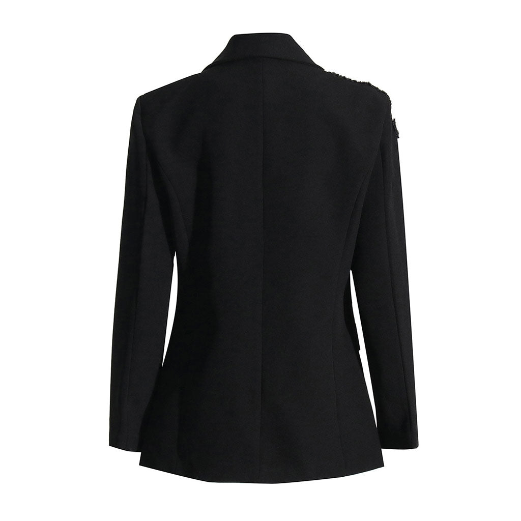 Wanting a more festive option with your blazer choose? Consider playing with the high-shine detailing. like a blazer with crystal stones. Made in the black hue with crystal rose encrusted on the shoulder for a sparkling hint of shine. this designer blazer features lapel collars. long sleeves and two flap pockets to the front. The one-breasted fastening is enhanced by the single button. making it for easy wear. Redefine your feminine look with this unique blazer and pair it with a long skirt. rhinestone heeled pumps.