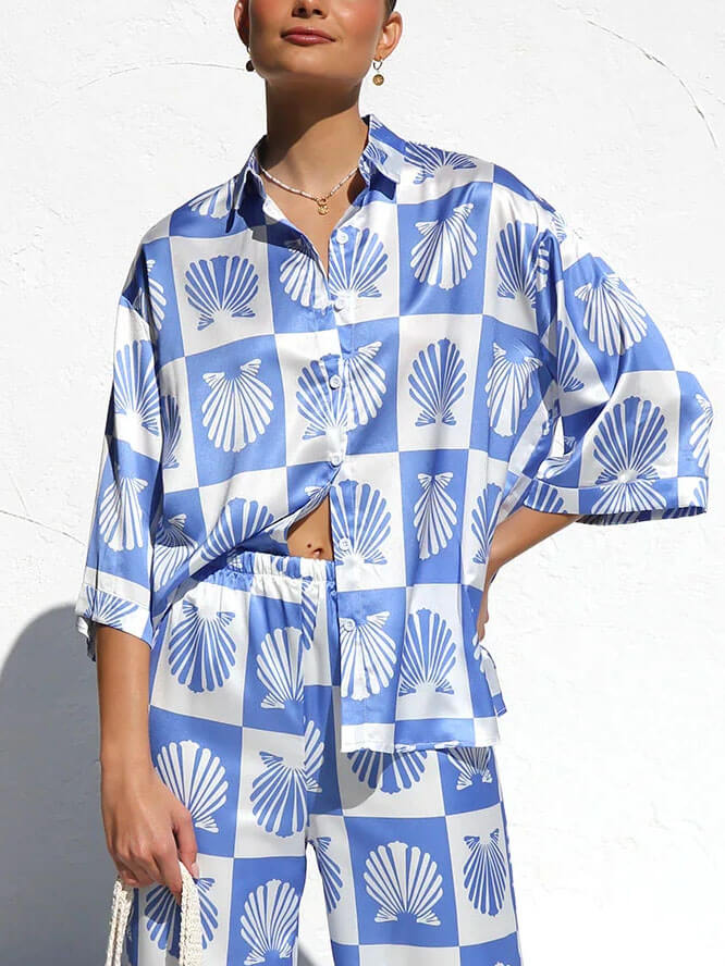 “Introducing our Special Satin Shell Print Button-Down Shirt. Made from luxurious satin fabric. this shirt features a unique shell print design that adds a touch of elegance to any outfit. With its button-down style. it offers both comfort and style. Perfect for adding a sophisticated flair to your wardrobe."