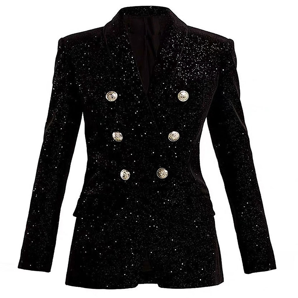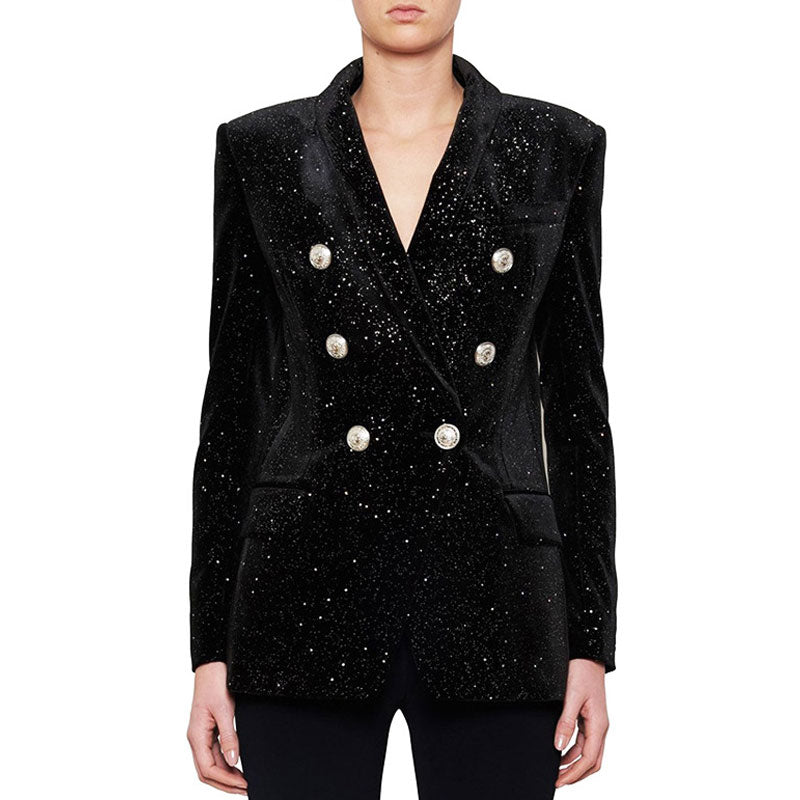 This glittering designer velvet blazer seamlessly marries elegance with trendsetting style. Its jacket-style cut features a cinched waist. padded shoulders. and long sleeves with buttoned cuffs. exuding a sleek. slim-fit appeal. The Galaxy-inspired glitter and stars add a meteoric allure. while slender shawl lapels and antiqued silver-tone embossed buttons on flap pockets showcase its distinct design. A size up for flexible movement. ensuring you're not confined while embracing sophistication.