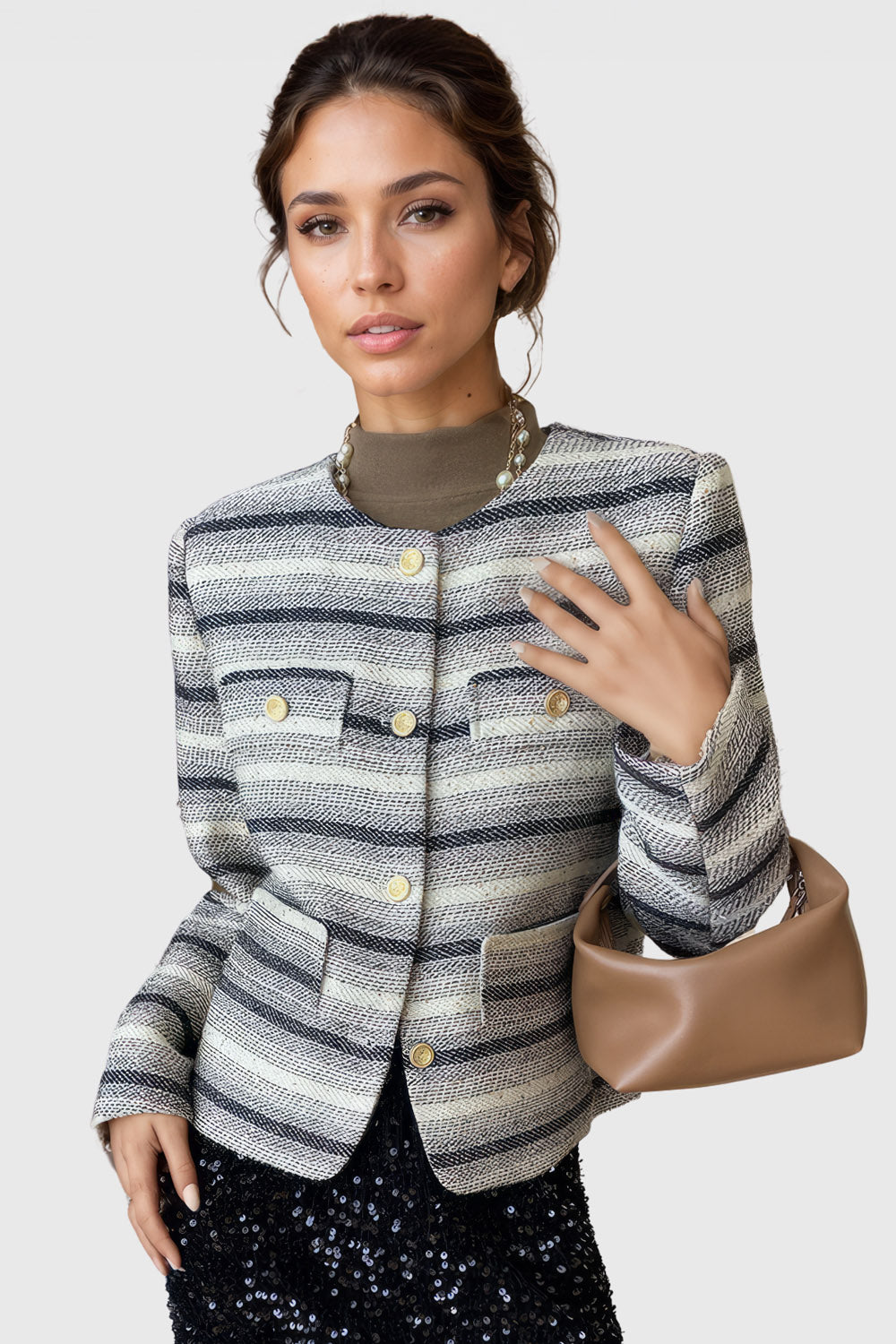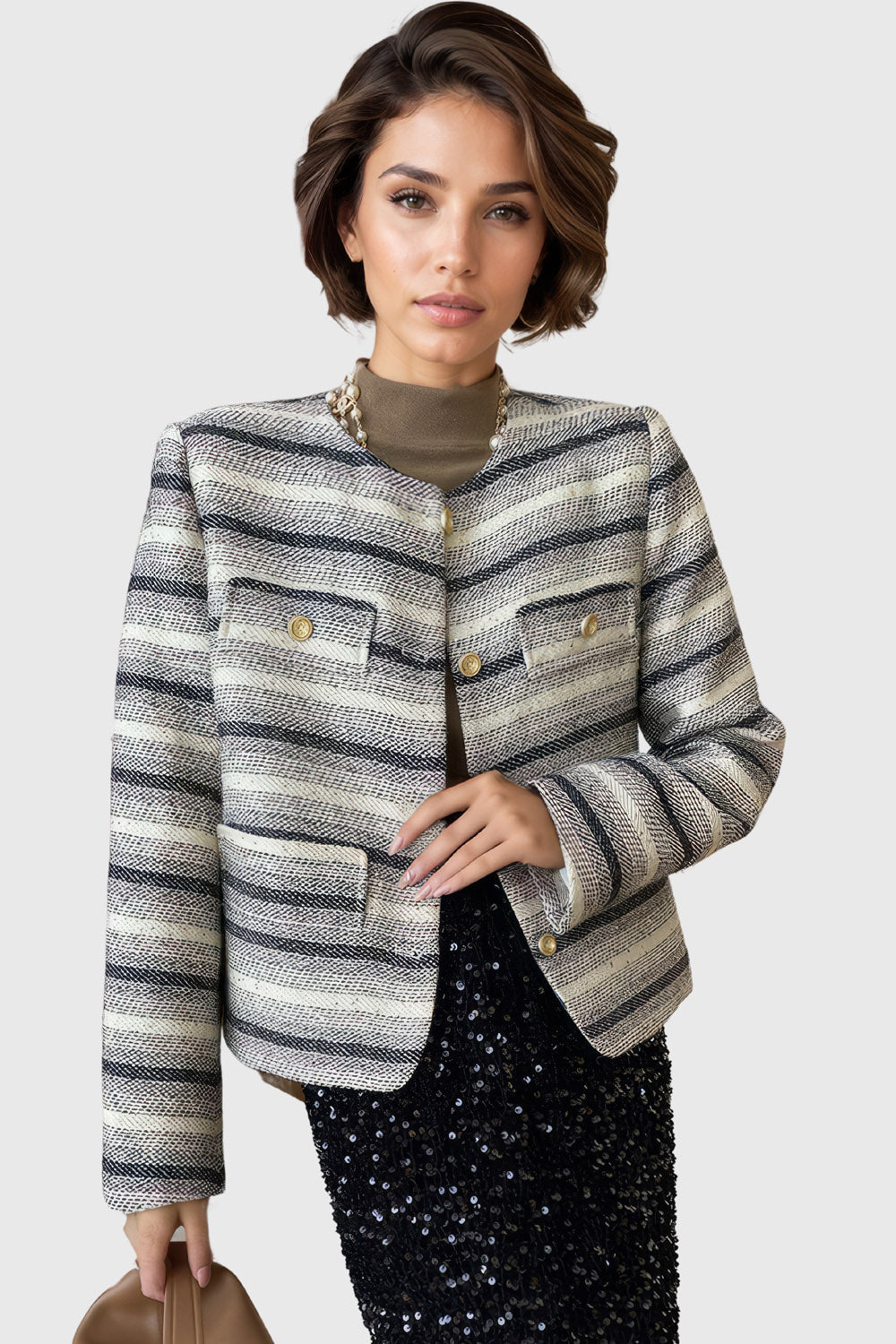 This striped minimalist jacket is the perfect blend of modern comfort and style. Long sleeves. a front closure. and golden snap-buttons make it easy to wear while the padded shoulders and round neck make it look chic.