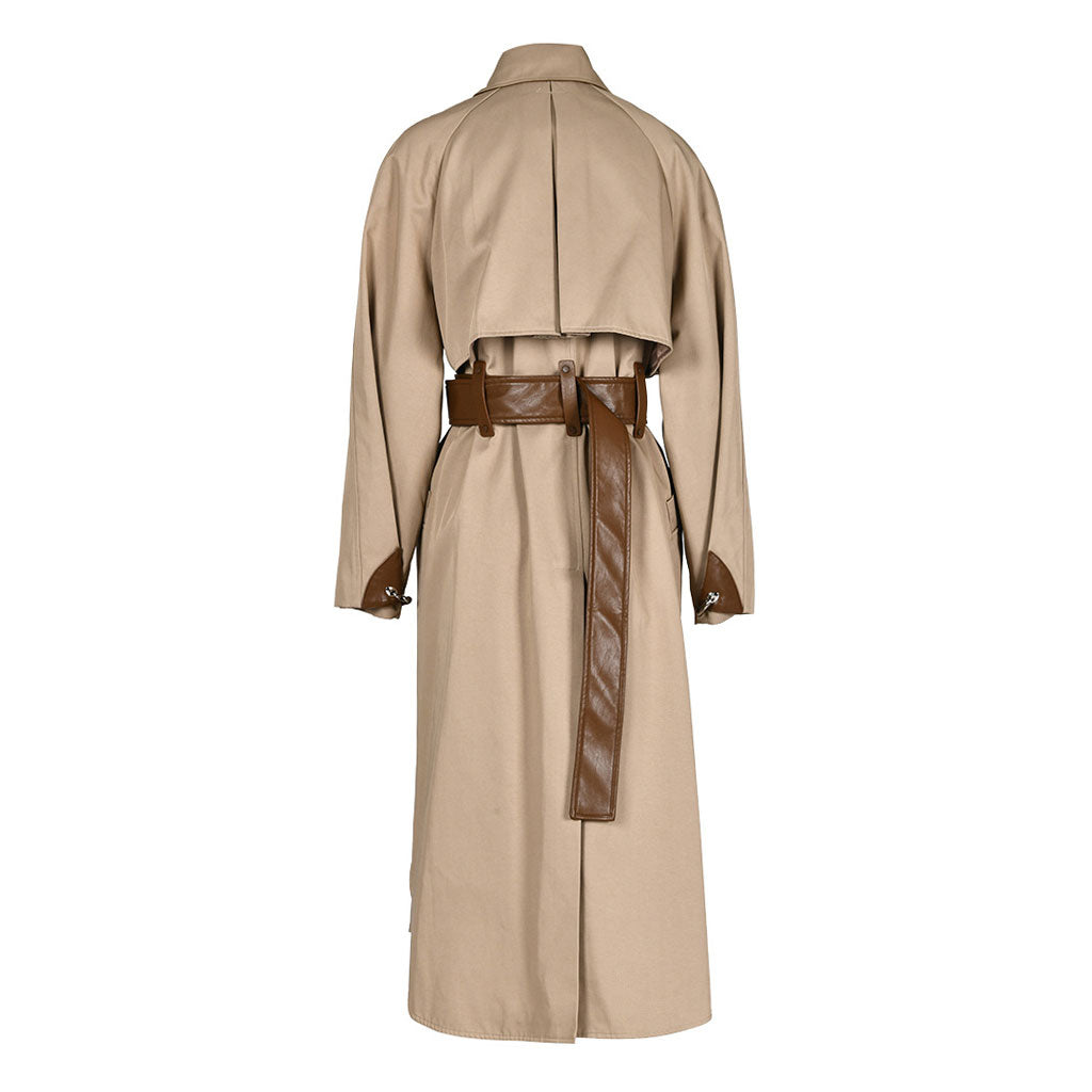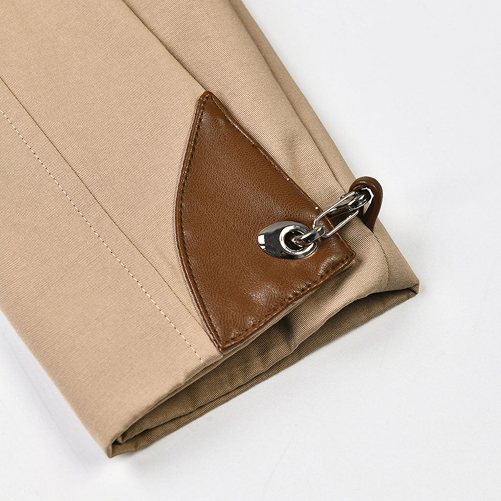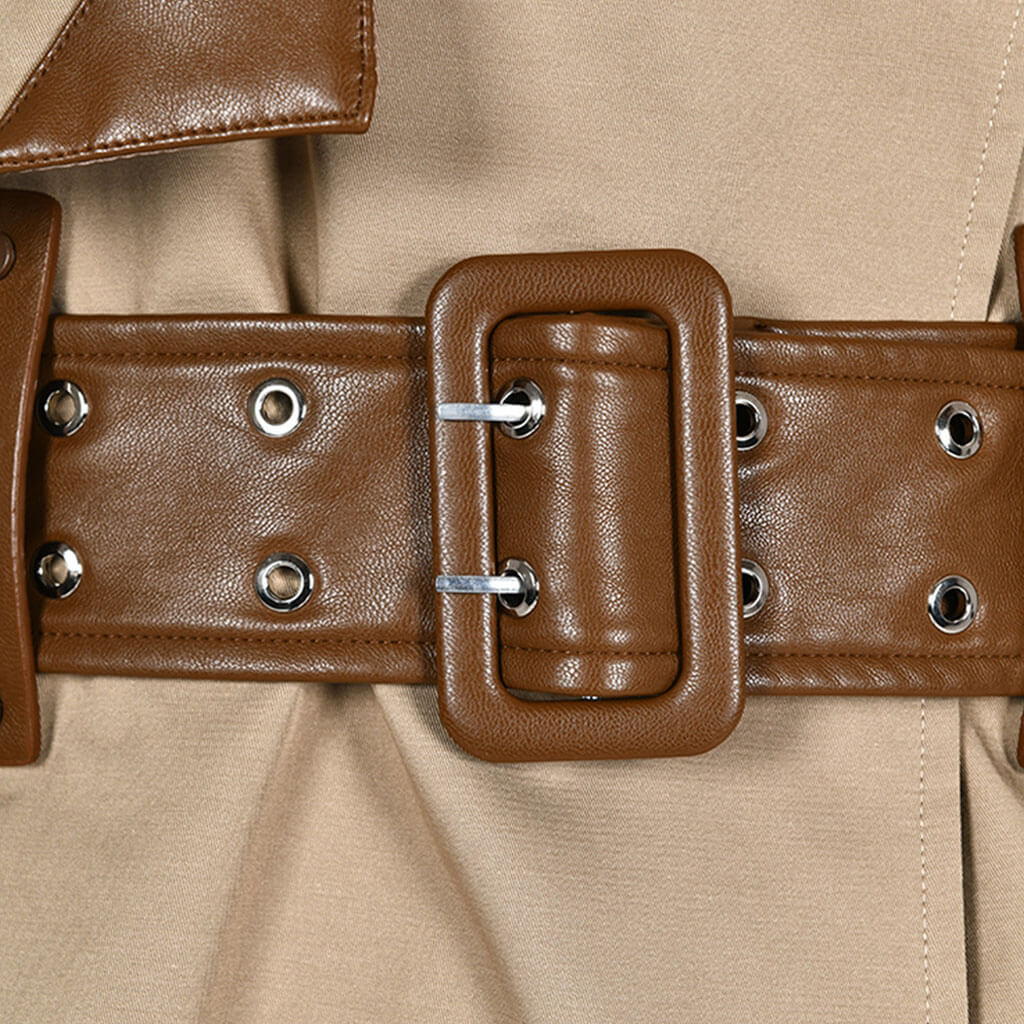 Tasteful Scarf Collared Long Sleeve Belted Cargo Pocket Leather Hybrid Trench Coat