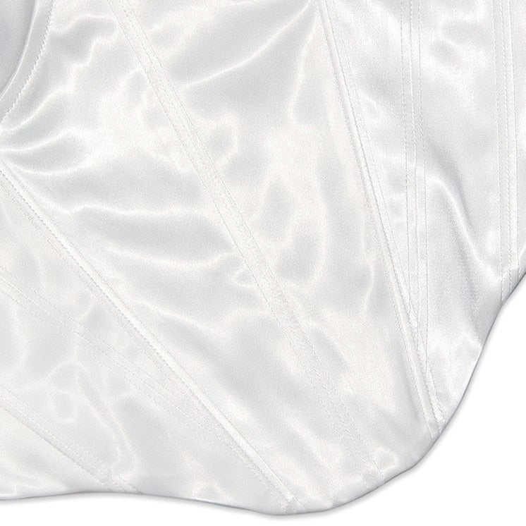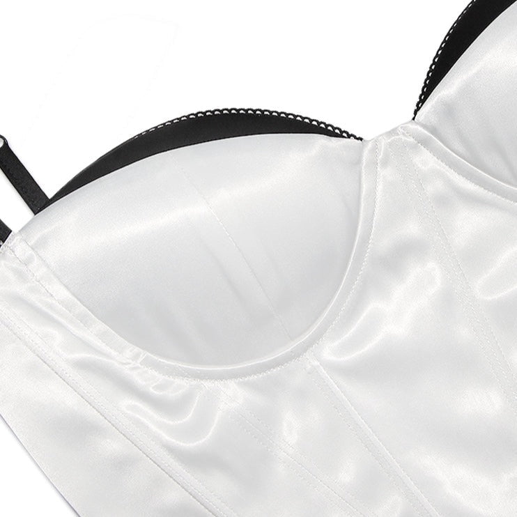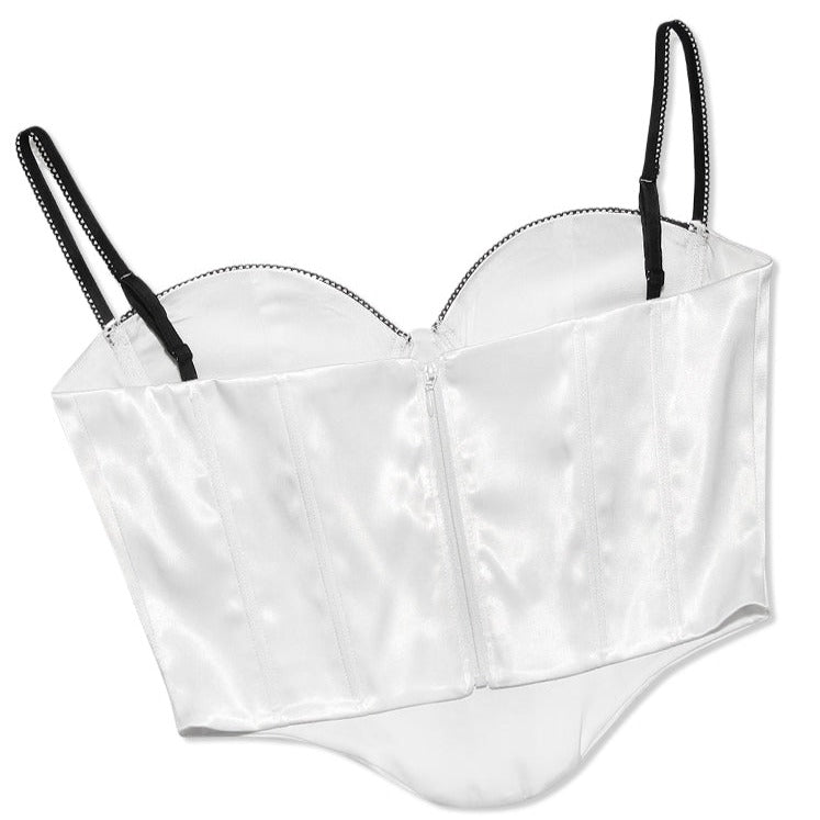 This FUYUKO WHITE CORSET features a zipper closure on the back and straps with black detailing across the bust.