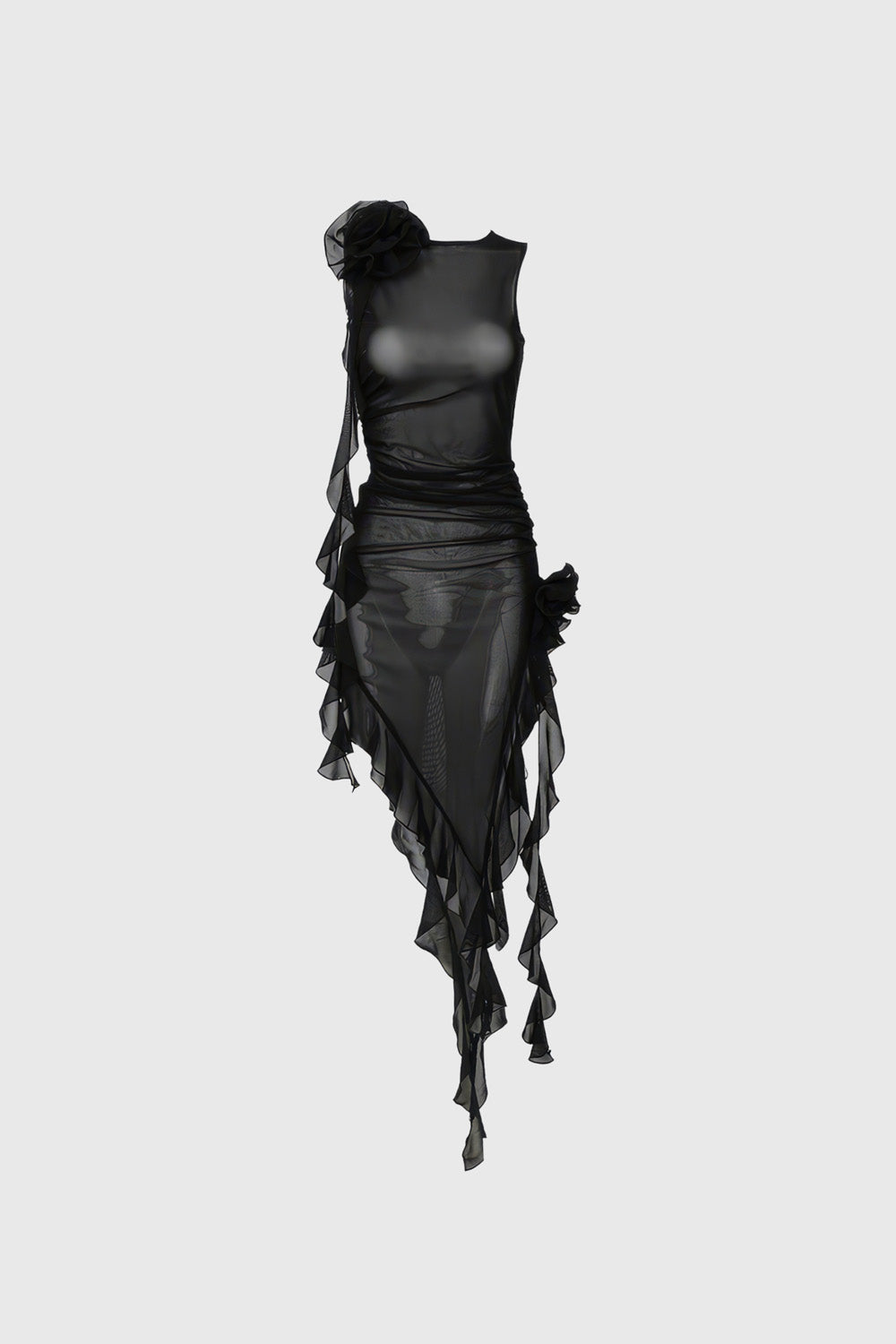 Midi dress in transparent mesh fabric. The dress has ruffles and flowers attached.