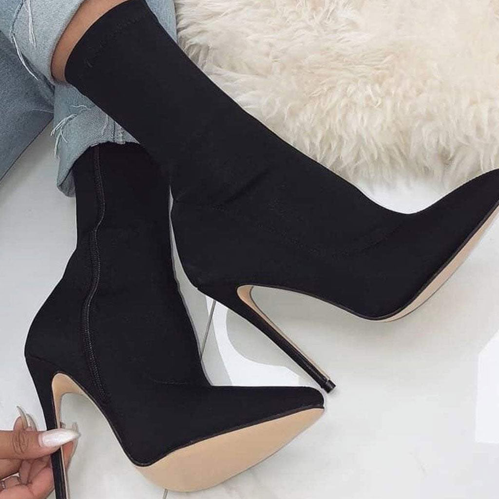 Having a sleek silhouette in a night out black tone. this pair of classy boots is an effortless pick for your outfit from season to season. Made from imitated suede fabric. these luxury stiletto boots also feature a mid calf with a pointed almond toe. a slender high stiletto heel. a slip-on style with side zip fastening. Style this pair with our designer outfit to rock yourself at your upcoming event. Whether it is a party. homecoming. anniversary or others. our designer shoes collection will contain more designer boots for women.