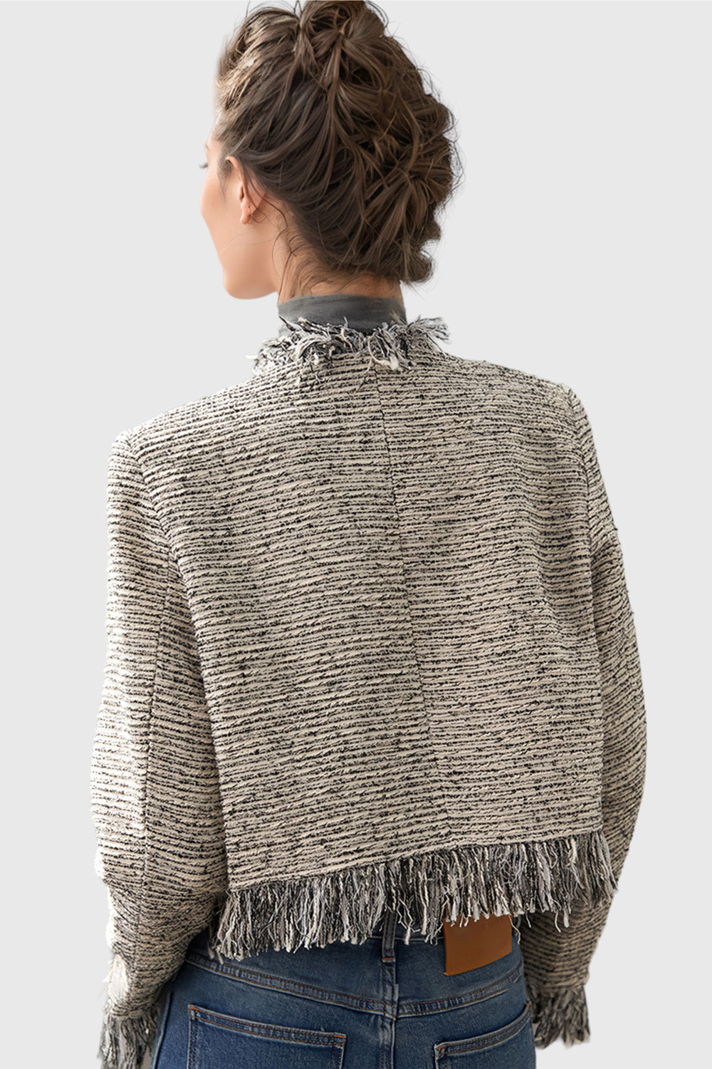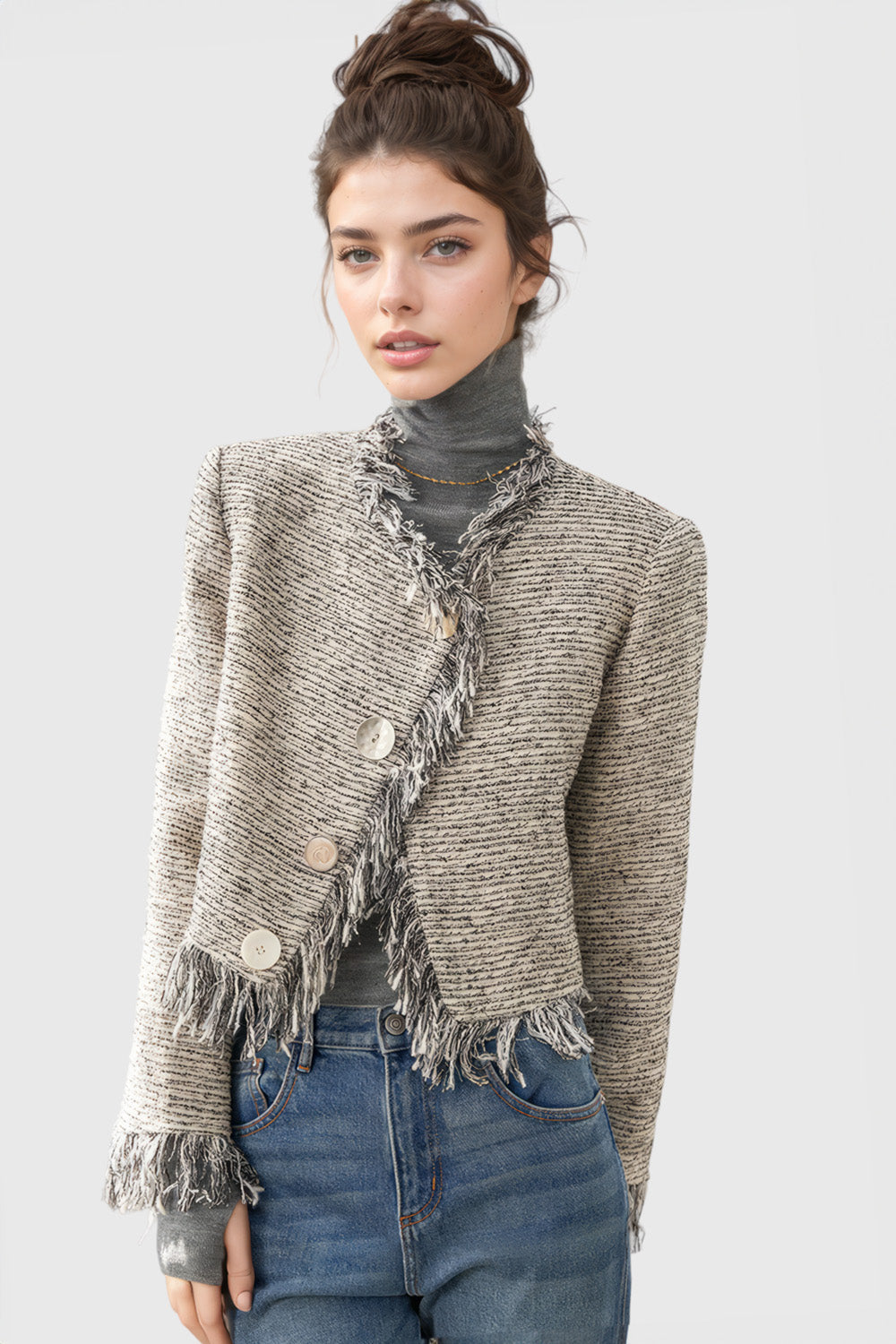 This classic tweed jacket has a short. textured style with fringe at the ends. a regular fit. and classic button detailing. It's the perfect piece for styling a timeless. contemporary look.