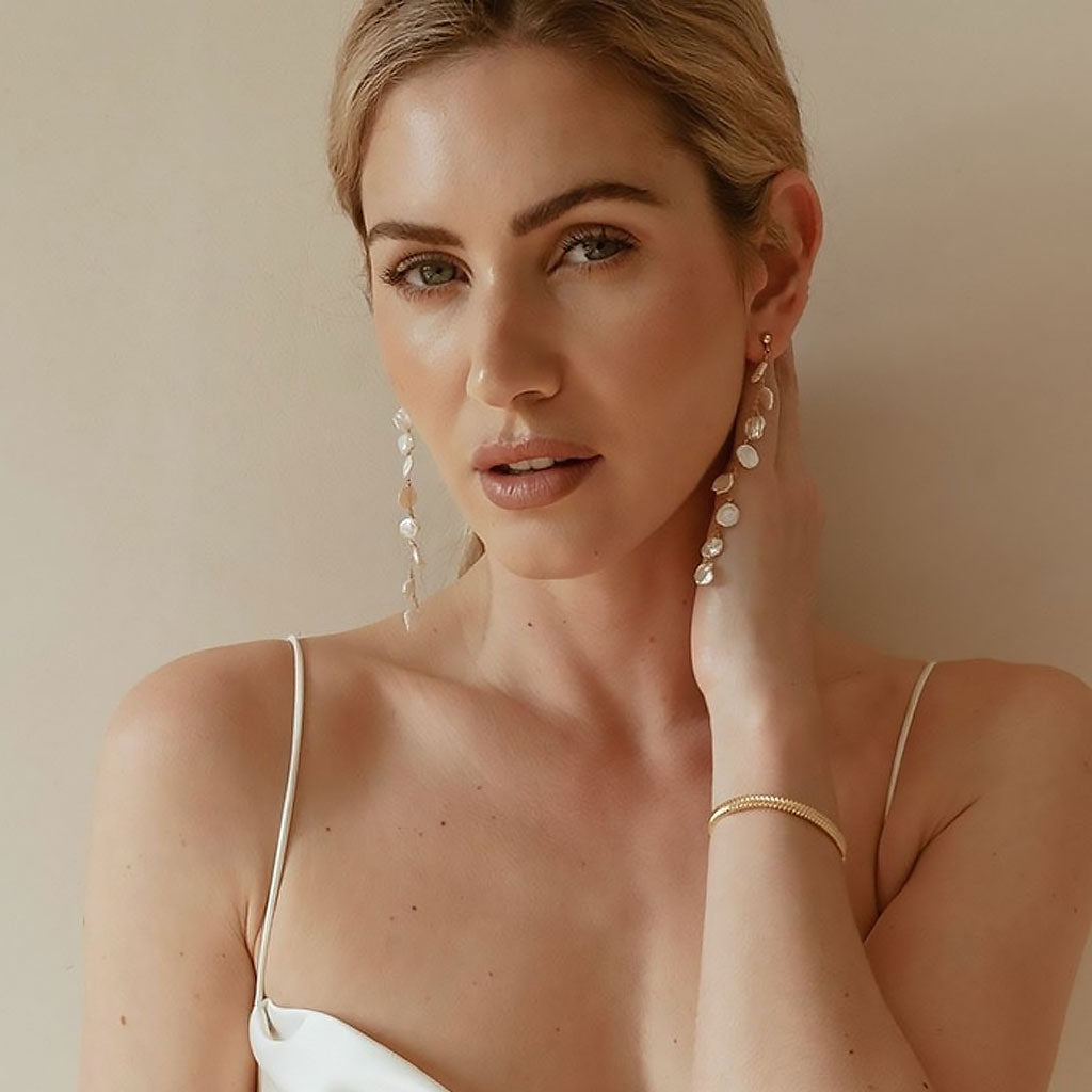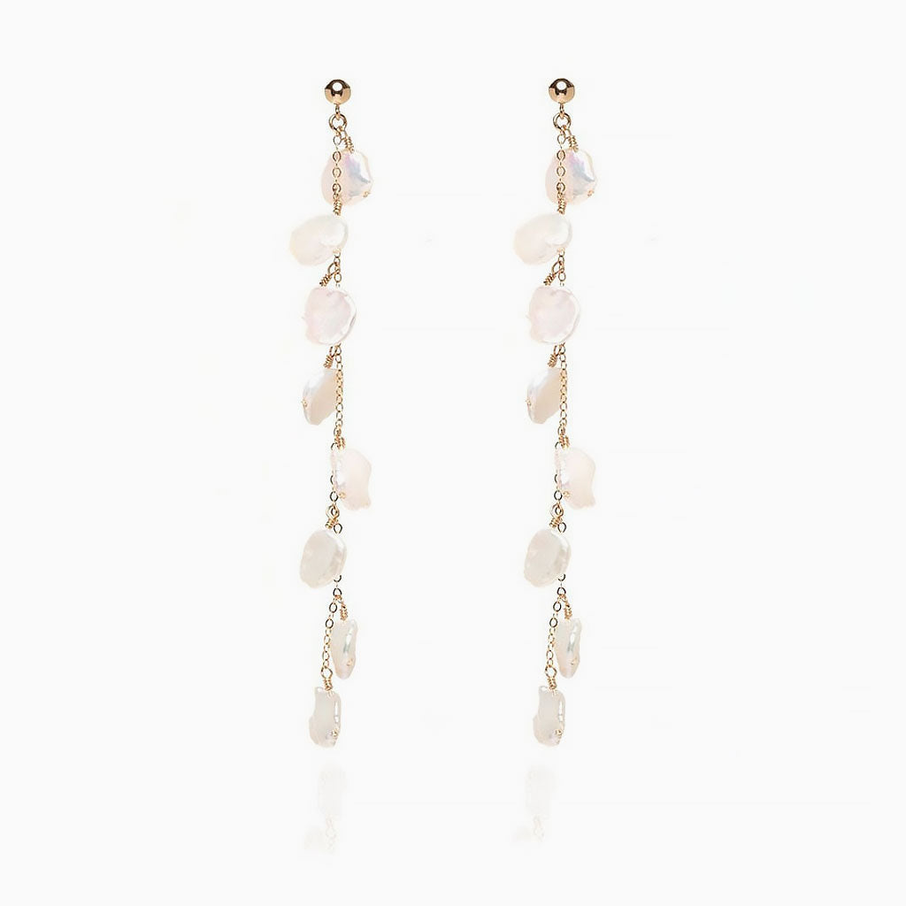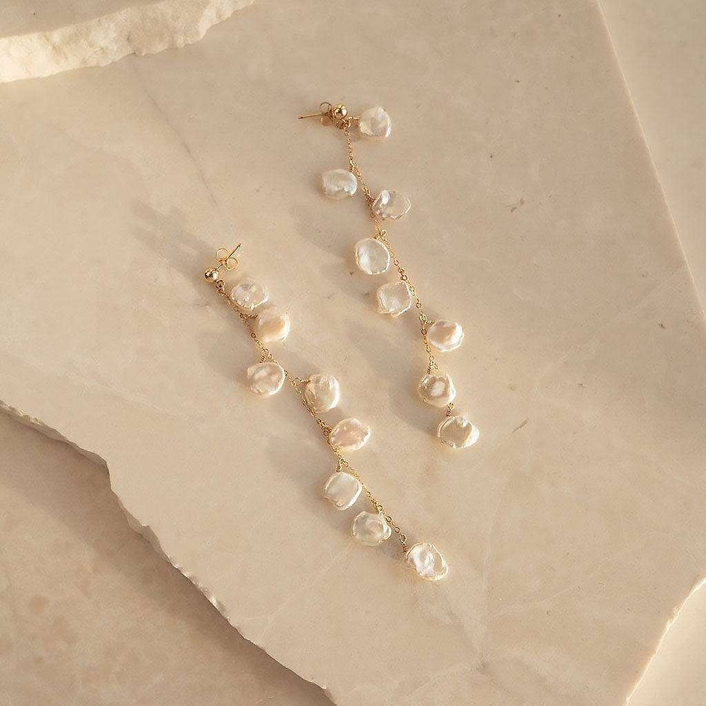 Wedding 18K Gold Plated Baroque Petal Pearl Cable Chain Drop Earrings