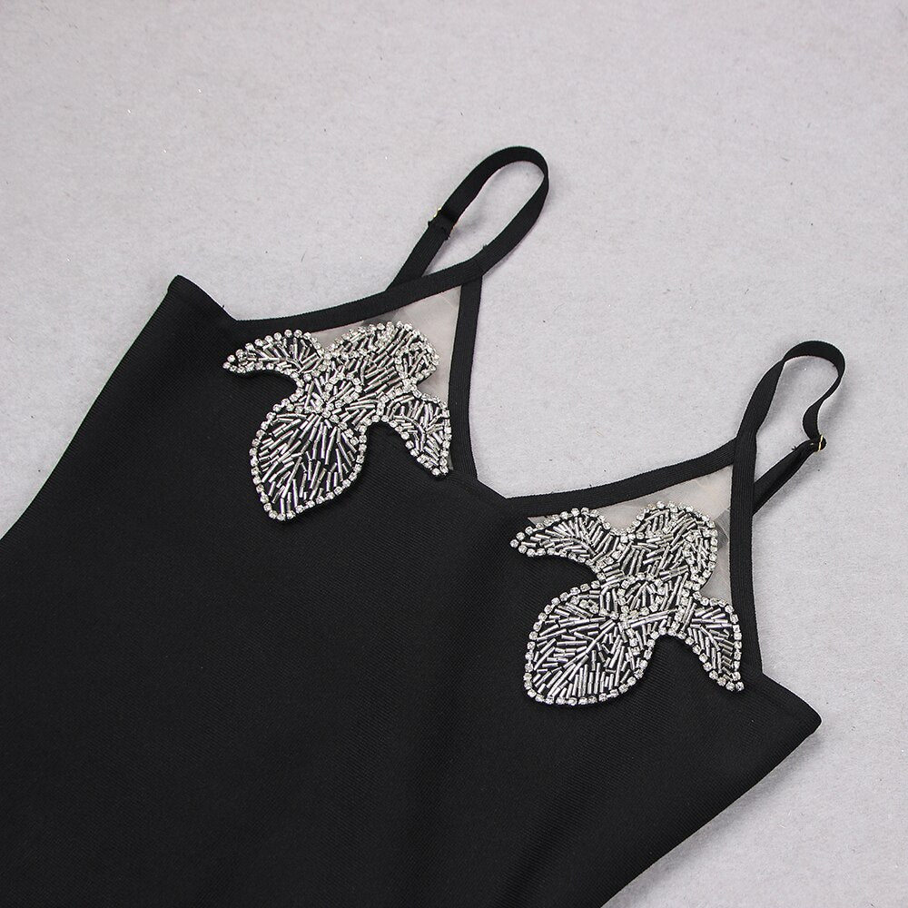 Featuring a striking black mini dress. this stylish piece features shoulder straps and a bust embellished with intricate patchwork of crystal flowers.